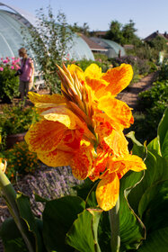 Farbbeschreibung: Blüten gelb mit Flecken und Tupfen in orange, Blätter grünDer eigentliche Zierwert bei Cannas sind nicht nur die Blüten, sondern zusätzlich die großen grünen, braunroten oder bunten panaschierten Laubblätter. Sie sind schnellwüchsige, exotische, sommerblühende Schmuckpflanzen und bringen in jedem Pflanzgefäß oder Beet Höhe sowie Dynamik. Viele Sorten werden auch gerne von Insekten als Nahrungsquelle genutzt. Cannas verlangen einen vollsonnigen, eher windgeschützten Standort in nährstoffreichem, humosem Boden, der immer gut feucht sein sollte. Trockenheit tolerieren die Pflanzen im Spätsommer kurzzeitig sehr gut. Durch eine Vorkultur ab Ende Februar kann die Blütezeit deutlich verfrüht werden.