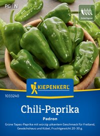 Die Chili-Paprika 'Padron' bringt von Grün nach Rot reifende, 20-30 g schwere Früchte hervor. Die grünen Früchte sind besonders beliebt als "Pimientos de Padron", die gebacken und gesalzen werden – eine spanische Delikatesse. Mit 500-2.500 Scoville gehören sie zu den leicht scharfen Chilis und sind perfekt für geschützte Stellen im Freiland, Gewächshaus, Hochbeet und Kübel. Ihre Wuchshöhe beträgt 80 bis 100 cm. Entdecken Sie den einzigartigen Geschmack der 'Padron' und verleihen Sie Ihren Gerichten ein spanisches Flair! Diese chilischoten sind vielseitig einsetzbar und sorgen für köstliche Geschmackserlebnisse. Lassen Sie die Chili-Paprika 'Padron' in Ihre Küche einziehen und genießen Sie die Vielfalt!| Kurzbezeichnung : | Chili-Paprika Padron |