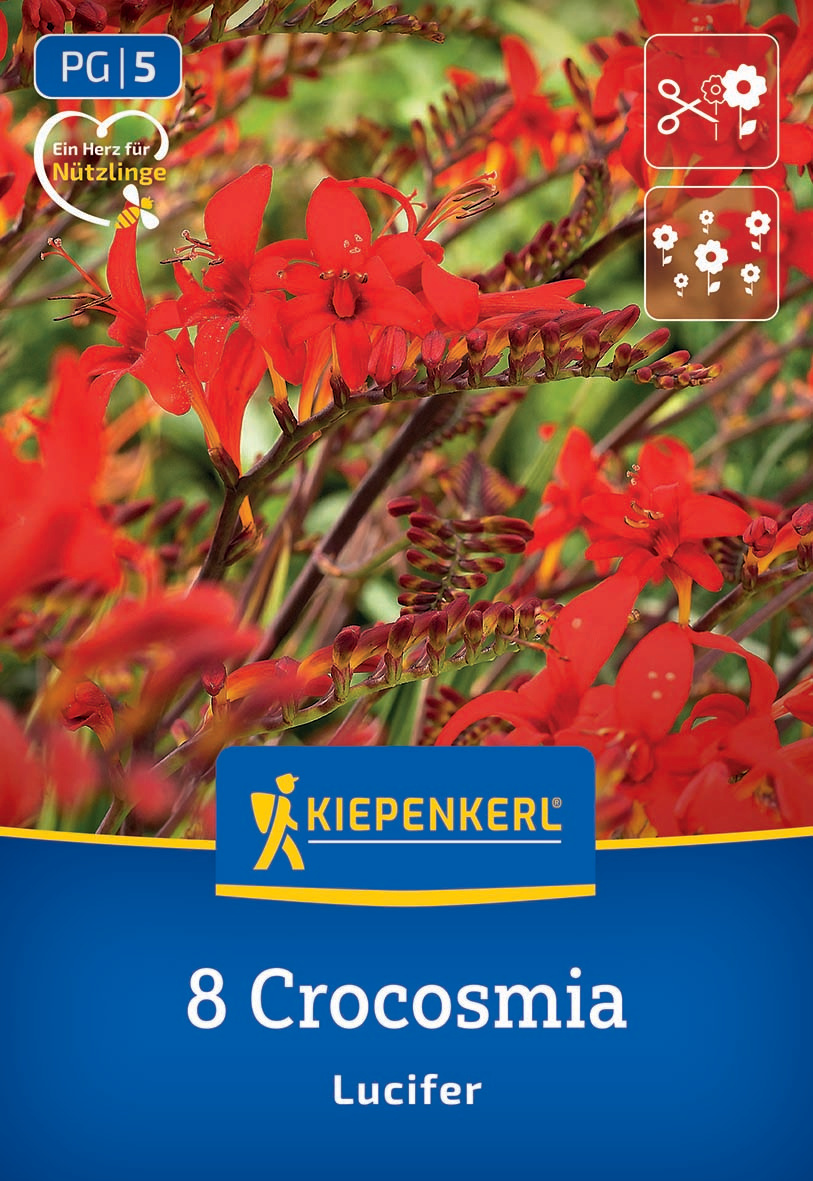 Die Montbretie 'Lucifer' wächst mit wunderschönen, großen Blüten. Die zahlreichen Blüten erstrahlen in einem Feuerrotton und sind daher ein echter Hingucker in Ihrem Beet. Erfreuen Sie sich viele Jahre an der Blume, da diese mehrjährig wächst. Sie ist für den Vasenschnitt geeignet und bietet als Vorteil dabei eine guter Haltbarkeit.| Kurzbezeichnung : | Crocosmia Lucifer |