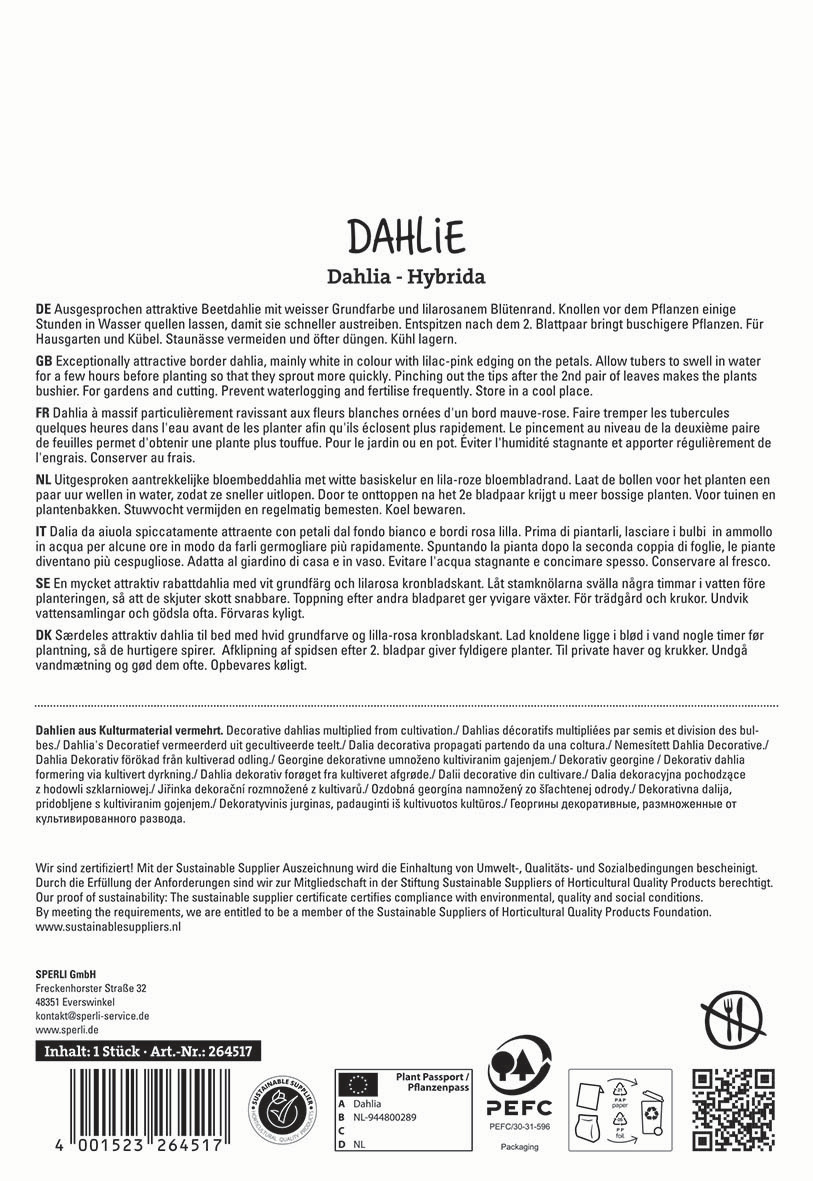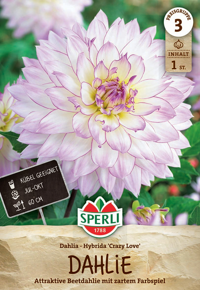 Die Dahlie 'Crazy Love' überzeugt durch ihre magisch anmutenden Blüten. Mit ihrer weißen Grundfarbe und dem lila-rosa Blütenrand geben sie ein exquisites, einmaliges Bild in Deinem Beet ab. Auch Deinen Kübeln verleihen sie mit ihrem zarten Wesen einen wunderbar stilvollen Mehrwert. Schon im April bis Juni kannst Du die Blumenzwiebel in einen frostfreien Boden pflanzen, damit sie dann zwischen Juli und Oktober im vollen Glanz erstrahlt. Gib Deinen Dahlienknollen etwas Hilfe, indem Du sie wenige Stunden vor dem Einpflanzen in Wasser quellen lässt.Kurzbezeichnung : | Dahlie Crazy Love |