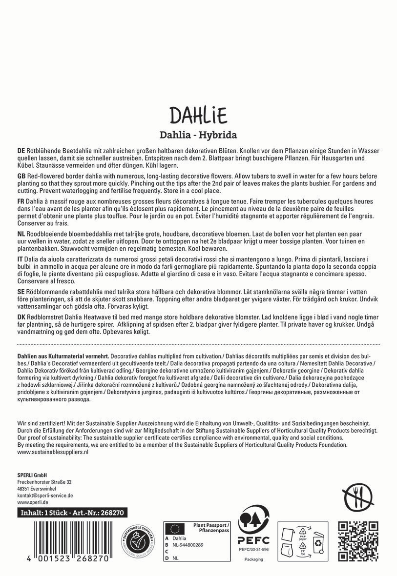 An der klassische Beetdahlie 'Heatwave' ist besonders, dass sie Dir sehr haltbare Blüten bietet. Die vielen, großen Blüten leuchten satt Rot. 'Heatwave' fühlt sich klassich gepflanzt in Flachbeeten wohl. Du kannst die Knollen aber auch in Töpfe oder in ein Hochbeet setzen. Dort erreicht die Dahlie eine Wuchshöhe von 55 cm. Staunässe verträgt die Beetdahlie nicht. Lange Freude hast Du an ihr, wenn Du sie öfter düngst und als Standort einen sonnigen bis halbschattigen Platz im Garten oder auf dem Balkon wählst. Wer den Wuchs beschleunigen möchte, kann die Knollen vor dem Pflanzen einige Stunden in Wasser legen. So treiben sie schneller aus.