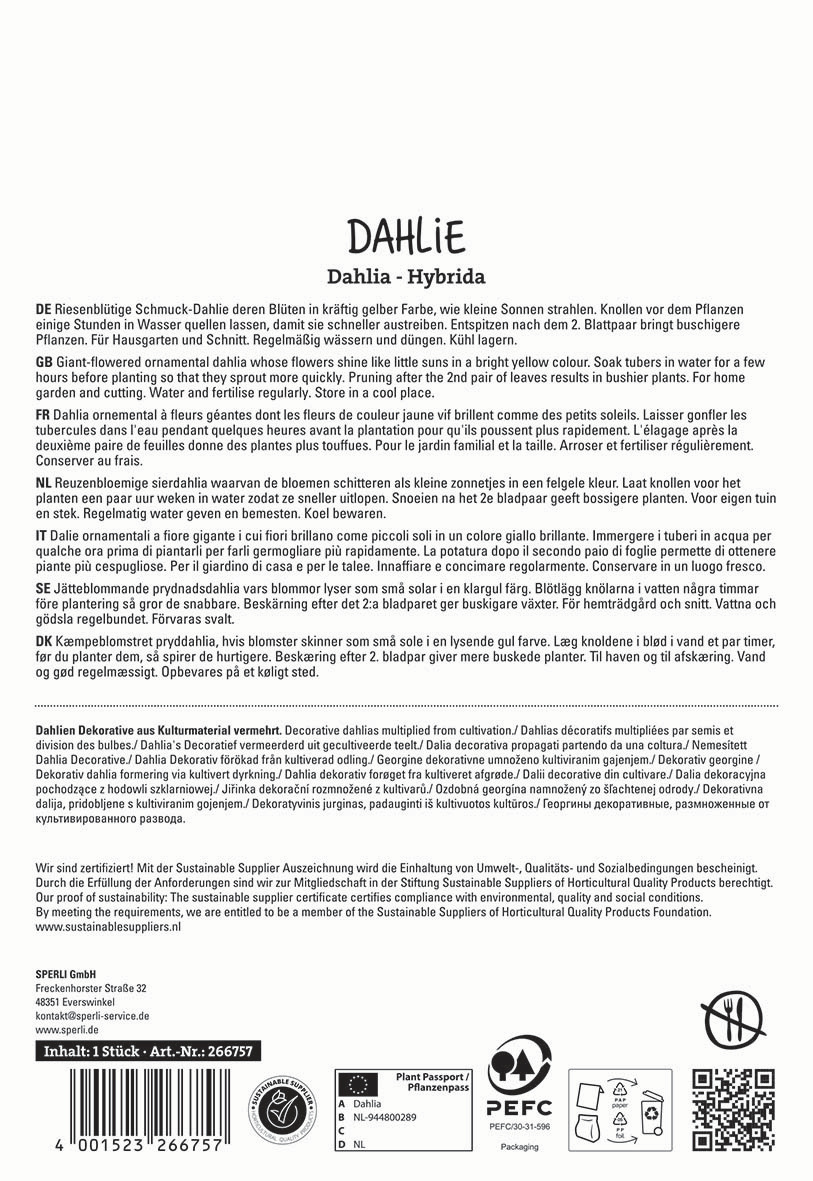 Die Blüten der großblütigen Schmuckdahlie 'Kelvin Floodlight' sind nicht nur riesig, sondern strahlen auch wie kleine Sonnen in kräftig gelber Farbe. Es handelt sich bei dieser Sorte um eine Dahlie für Beete und Rabatten, die wie viele andere Dahliensorten auch abgeschnitten und als Strauß im Wohnraum aufgestellt werden kann.