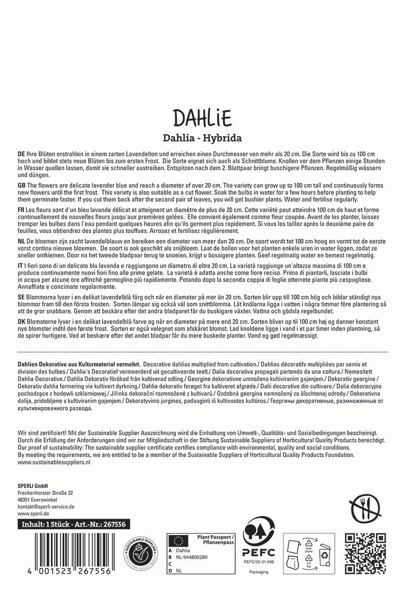 Die großblumige Schmuck-Dahlie „Lavander Perfection“ präsentiert sich mit zarten rosa Blüten, die durch ihre gefüllte Blütenform besonders üppig und dekorativ wirken. Mit ei-ner Wuchshöhe von etwa 100 cm und einer Wuchsbreite von 40 cm eignet sich diese Dahlie ideal für die Beetbepflanzung vor allem auch in Kombination mit weiteren Stau-den. „Lavander Perfection“ bevorzugt einen sonnigen Standort und gedeiht auf normalen Gartenböden. Die Blütezeit erstreckt sich von Juli bis Oktober, wobei die Sorte durch ihre dauerblühen-de Eigenschaft eine langanhaltende Farbpracht im Garten garantiert. Die robusten Stiele sorgen für eine stabile Blütenhaltung und machen die Dahlie besonders schnittgeeignet. Für eine optimale Entwicklung empfiehlt sich eine regelmäßige Wasserversorgung ohne Staunässe sowie eine ausgewogene Düngung. Die Sorte zeichnet sich durch hohe Keim-fähigkeit und gute Widerstandsfähigkeit gegenüber gängigen Krankheiten aus. Mit der Schmuck-Dahlie „Lavander Perfection“ bekommst Du eine hochwertige Pflanze, die durch ihre elegante Farbgebung, stabile Wuchsform und dauerhafte Blütenfreude überzeugt. Durch ihre anspruchslose Pflege und der üppigen Blütenpracht eignet sie sich hervorragend für Garten-Neulinge.| Kurzbezeichnung : | Dahlie Lavender Perfection |