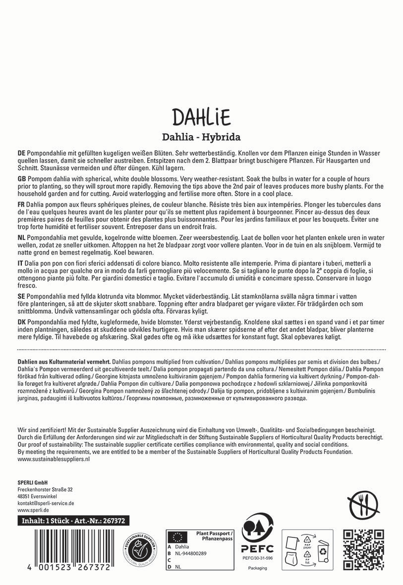 Ein Traum in jedem Brautstrauß ist diese stilvolle Dahlie 'Petra's Wedding' mit ihren gefüllten, kugelförmigen, weißen Blüten. Diese Dahlie blüht in Deinem Wohlfühlgarten vom Sommer bis zum Herbst. Die erfrischende Pompon-Dahlie ist mehrjährig, d. h., wenn Du sie auch im nächsten Jahr bewundern möchtest, brauchst Du ihre Frühjahrsblumenzwiebeln über den Winter einfach nur trocken zu lagern und sie im nächsten Jahr wieder an ein sonniges Örtchen zu pflanzen. Sie zeigt sich sehr wetterbeständig.