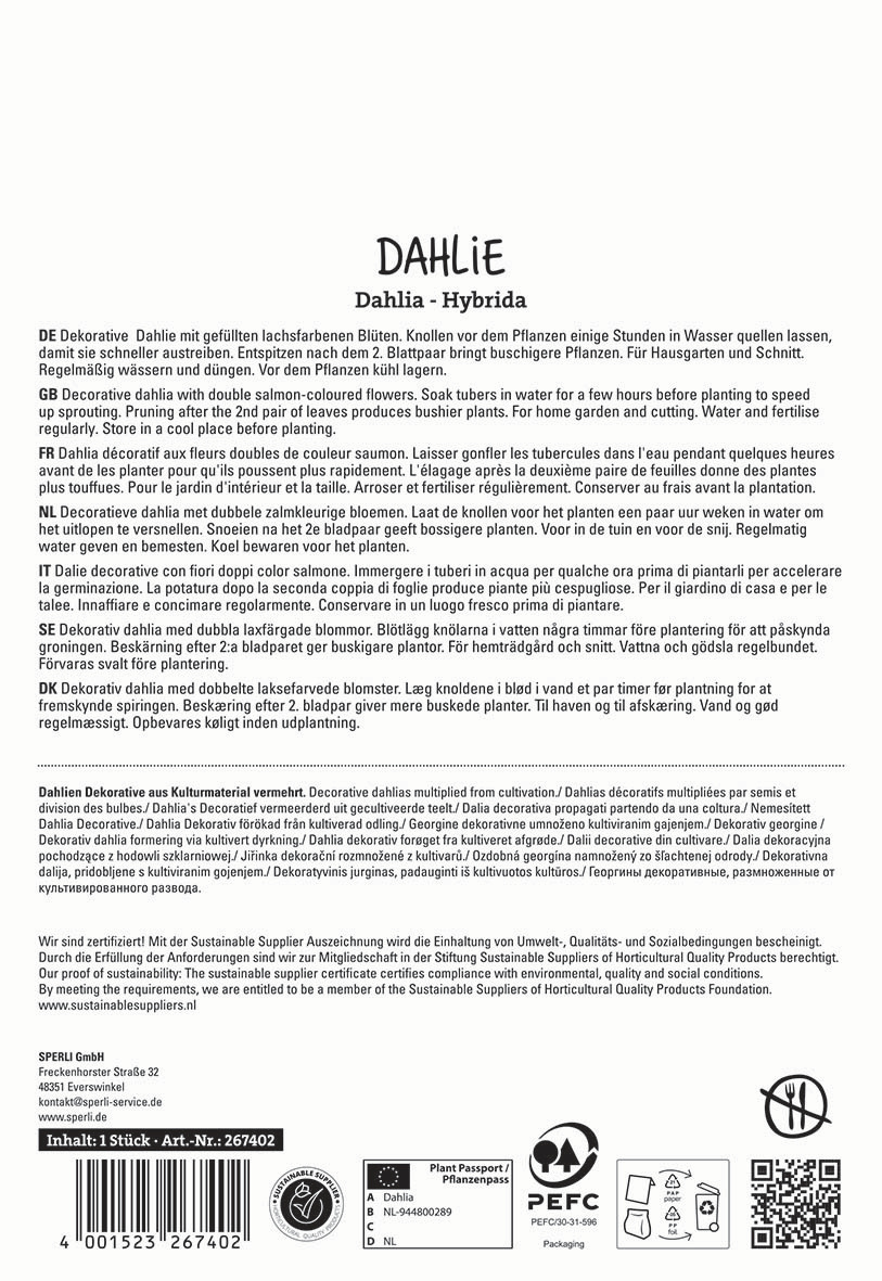 Einen besonderen Charme versprüht die Dekorativ-Dahlie 'Sebastian'. Sie zeichnet sich sowohl durch ihre lachsfarbenen, als auch dicht gefüllten Blütenbälle aus. Diese imponierende Dahlie lässt sich aufgrund ihrer Wuchshöhe von 70 cm gut in Kübeln anbauen, kann natürlich aber auch im Beet gepflanzt werden. Des Weiteren ist die 'Sebastian' eine haltbare und für Schnittblumen geeignete Dahlie.Kurzbezeichnung : | Dahlie Sebastian |