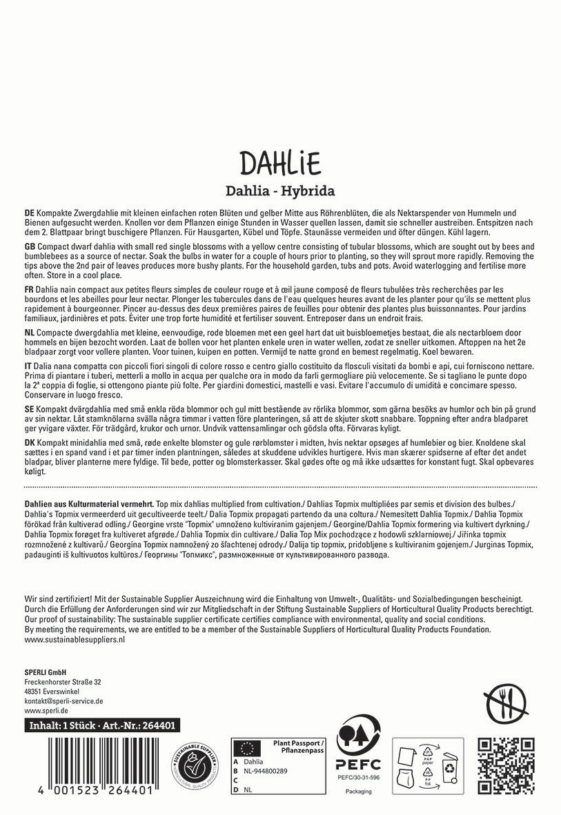 Die wunderschöne, kompakte Zwergdahlie 'Topmix Rood' zaubert lauter kleine, einfache rote Blüten mit gelber Mitte aus Röhrenblüten in Beete und Kübel. Die Röhrenblüten dienen als Nektarlieferant für Insekten. An einem sonnigen bis halbschattigen Platz wird die mehrjährige Dahlie 50 cm hoch. Durch diese niedrige Wuchshöhe ist sie sowohl für Flachbeete als auch für Kästen und Hochbeete geeignet. Wenn Du die Knollen vor dem Pflanzen einige Stunden in Wasser quellen lässt, treiben sie schneller aus. Entspitzt Du die Dahlie nach dem 2. Blattpaar, kannst Du Dich über eine buschige Pflanzen freuen. Staunässe sollte vermieden werden. Gut gedeiht diese Dahlie, wenn Du ihr öfter Dünger gönnst.