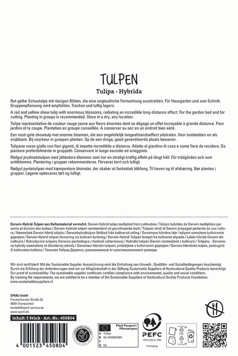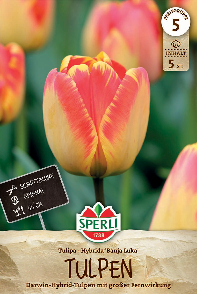 Schon von Weitem wirst Du Dich der atemberaubenden Wirkung der rot-gelben Darwin-Hybrid-Tulpe 'Banja Luka' nicht entziehen können! Die riesigen Blüten leuchten Dir auf 40 bis 60 cm hohen Stängeln sitzend mit aller Kraft entgegen. Steht 'Banja Luka' in Gruppen, ist sie ein noch attraktiverer Blickfang.