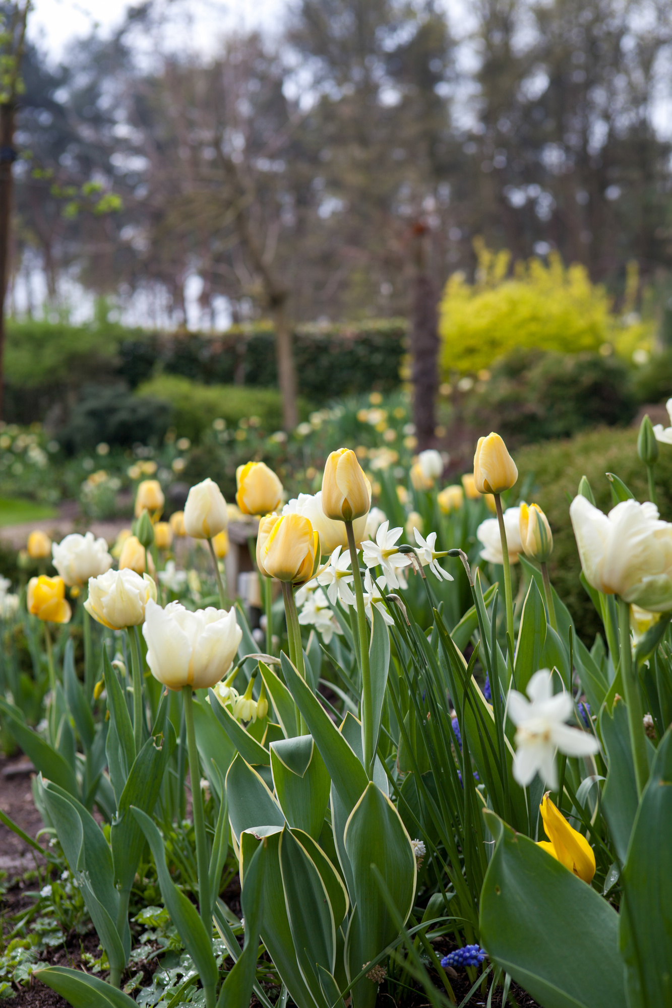Die Blüten sind Gelb geflammt und am Rand Cremeweiß, welches sich im Verblühen zu Weiß verändert. Die Blattränder sind teils schmal cremeweiß eingefärbt und wechseln in der Farbausprägung.| Kurzbezeichnung : | Darwin-Hybrid-Tulpen Jaap Groot |