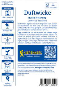 Duftwicken eignen sich hervorragend zum Begrünen von Zäunen und Rankhilfen im Beet und erfreuen mit ihren duftenden Blüten! Diese einjährigen Pflanzen erreichen eine beeindruckende Höhe von 150 bis 200 cm und sind auch ideal für die Vase geeignet, um die Schönheit der Natur in Ihr Zuhause zu bringen. Bitte beachten Sie: Der Verzehr kann gesundheitliche Komplikationen verursachen. Erleben Sie die Faszination dieser aufsteigenden Schönheiten in Ihrem Garten und lassen Sie sich von ihrem betörenden Duft verzaubern! Gestalten Sie mit Duftwicken lebendige, duftende Oasen, die sowohl Augen als auch Sinne erfreuen! Genießen Sie blühende Eleganz in Ihrem Garten mit den Duftwicken!| Kurzbezeichnung : | Duftwicke Bunte Mischung |