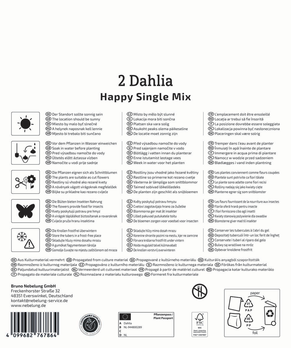 | Kurzbezeichnung : | Dunkellaubige Beetdahlie Happy Single Mix |