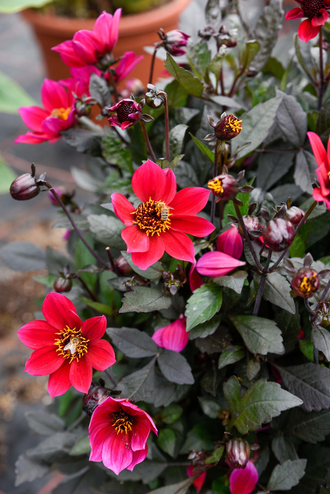 Kirschrote Blüten mit sehr dunklem Zentrum