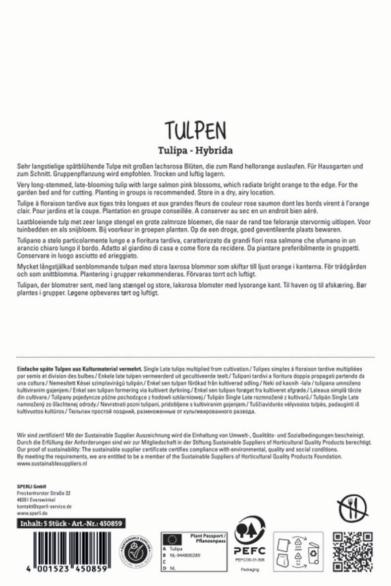 Die Einfache Späte Tulpe 'Menton' ist eine sehr langstielige Tulpe mit einer Höhe von ca. 65 cm, deren große Blüten lachsrosa schimmern und zum Rand in ein helles Orange auslaufen. Aufgrund dieser erfrischenden Farbkombination sehen die im Mai blühenden Schönheiten vor allem in der Vase überaus stilvoll aus.