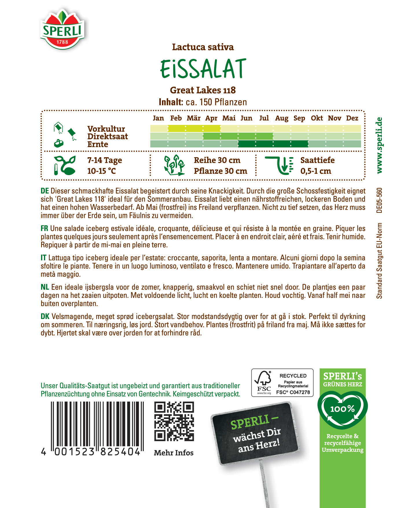 Bei dem Salat 'Great Lakes 118' von SPERLI handelt es sich um einen schossfesten Sommer-Eissalat. Im März und April kannst Du bereits mit der Vorkultur im Haus starten. Nach wenigen Tagen solltest Du die Jungpflanzen pikieren, allerdings nicht zu tief, um Blattfäulnis zu verhindern. Bis zum Aussetzen ins Freiland ab Mitte Mai sollten die Pflanzen hell, luftig und kühl stehen.