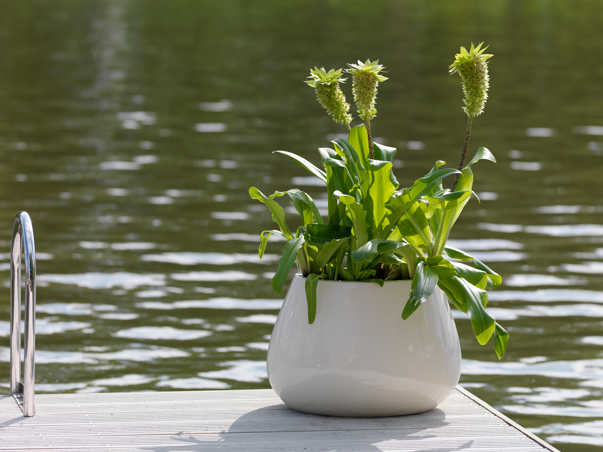 Nach der Blüte bilden sich auffällige, glänzende Samenstände, die ebenfalls eine dekorative Wirkung haben. In modernen Gartengestaltungen wird die Ananaslilie aufgrund ihrer exotischen Optik gerne in naturhafte Pflanzungen integriert, wo sie zwischen Gräsern und Farnen als Einzelaspekt wirkt. Ihr plakatives, fast aufdringliches Erscheinungsbild kommt besonders gut zur Geltung, wenn sie in größeren Gruppen gepflanzt wird. Bei einer Freilandkultur sollte sie an windgeschützten, möglichst warmen und sonnigen Standorten mit gut durchlässigem Boden gepflanzt werden. Der Pflanzabstand sollte etwa 40 cm betragen. Um sie im Frühling zu unterstützen, kann sie bereits im Haus vorgetrieben und ab Mitte Mai nach den letzten Frösten ins Freie gepflanzt werden.