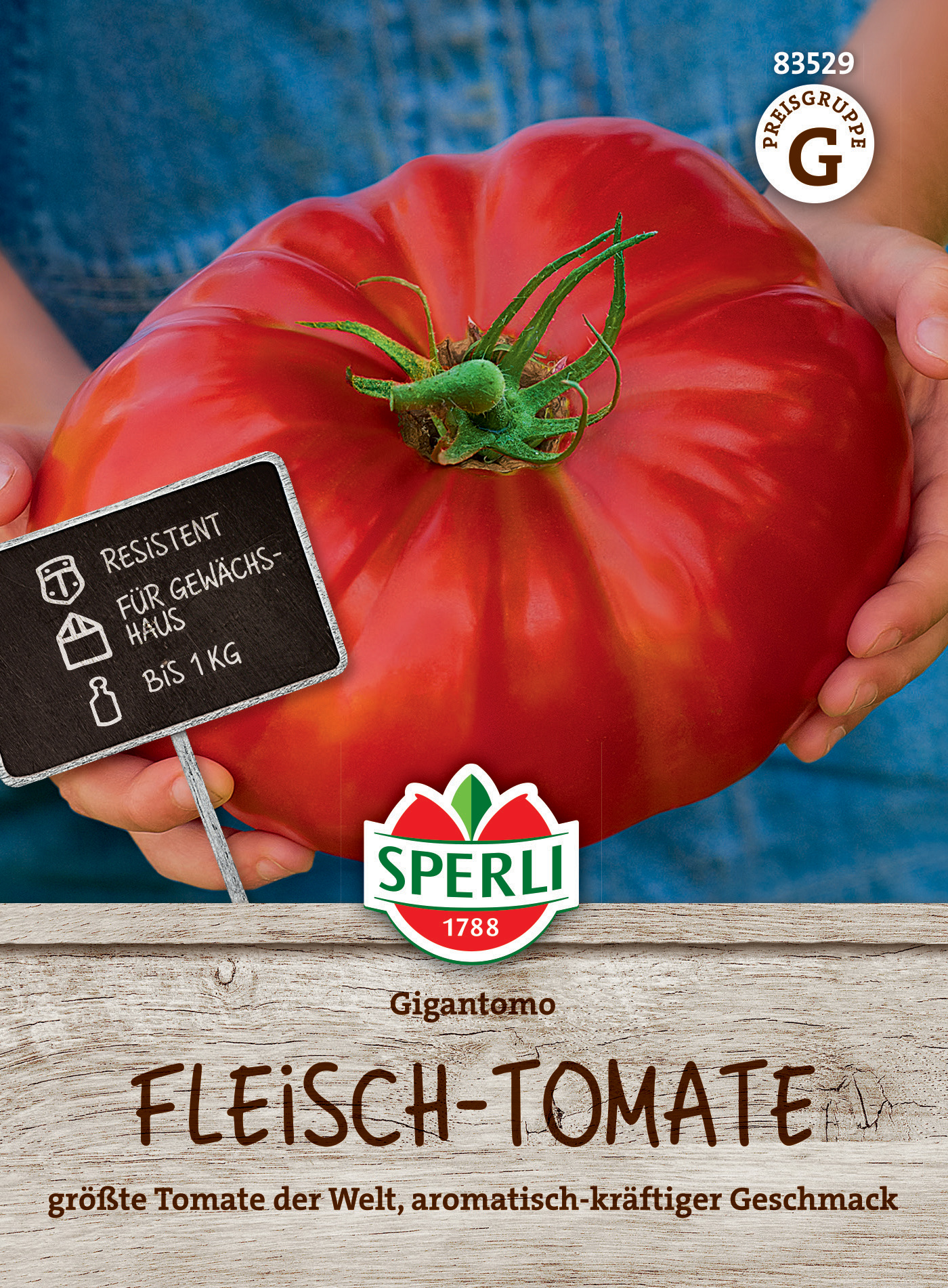 Mit ihrem Gewicht von bis zu 1 kg sind die Fleischtomaten der Sorte 'Gigantomo' wahre Riesen unter den Tomaten. Sie gelten als größte und schwerste Tomaten der Welt und sind somit ein echter Hingucker im Garten. Ihr Fruchtfleisch hat einen aromatischen, kräftigen Geschmack. Die Vorkultur ziehst Du bei dieser Sorte zwischen Februar und April, bevor Du die Jungpflanzen ab Mitte Mai ins geschützte Freiland setzt. Achte darauf, dass zu diesem Zeitpunkt keine Frostgefahr mehr besteht.