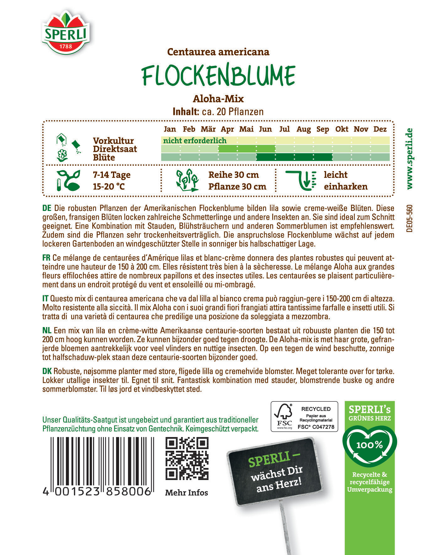 Die Kornblume 'Aloha' fällt besonders durch ihre Größe auf. Mit einer Wuchshöhe von bis zu 200 cm ist sie ein echter Hingucker in Deinem Garten! Doch auch als Schnittblume eignet sich diese Sorte bestens. Die lilafarbenen und creme-weißen Blüten ziehen Nützlinge magisch an. Schmetterlinge, Bienen und andere Nützlinge fühlen sich bei dieser Kornblume wohl. Sie ist außerdem sehr pflegeleicht, da sie trockenheitsverträglich ist.| Kurzbezeichnung : | Flockenblume Aloha-Mix |