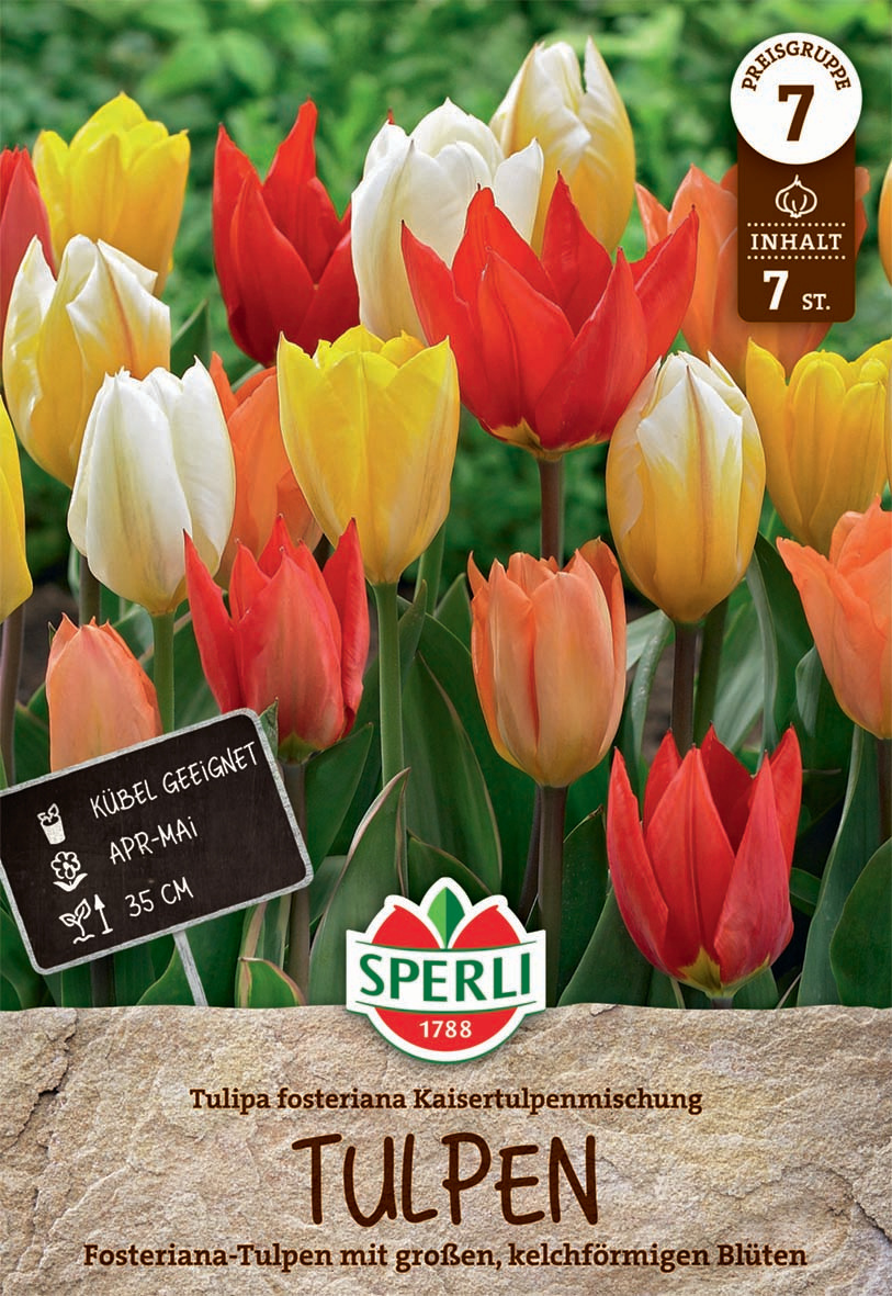 Farbenfroh muss der Frühling sein! Daher bieten wir Dir mit der Kaisertulpen-Mischung eine einzigartig bunte Kombination verschiedener Fosteriana-Tulpen! Die kräftigen, glockenförmigen Blüten in Orange, Weiß, Rot und Gelb werden auch bei Dir für Lebenslust und gute Laune sorgen, ob Du sie nun in Gruppen an Deine Beetränder oder in Kästen und Kübel pflanzt.