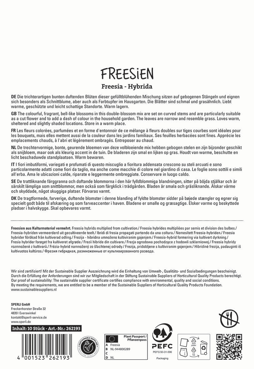 Duftend und herrlich bunt ist diese Mischung aus gefüllten Freesien, die im Juli und August in herrlicher Blüte stehen. Am liebsten mögen die Pflanzen einen leicht schattigen bis sonnigen Standort. Dort entfalten sie, egal ob im Beet oder Pflanzgefäß, ihre ganze Pracht. Aber auch als Schnittblumen in der Vase sehen diese 30 cm hohen Freesien hervorragend aus. Den Winter überstehen die Blumenzwiebeln gut, wenn Du sie trocken und warm einlagerst.| Kurzbezeichnung : | Freesien Gefüllte Duftmischung |