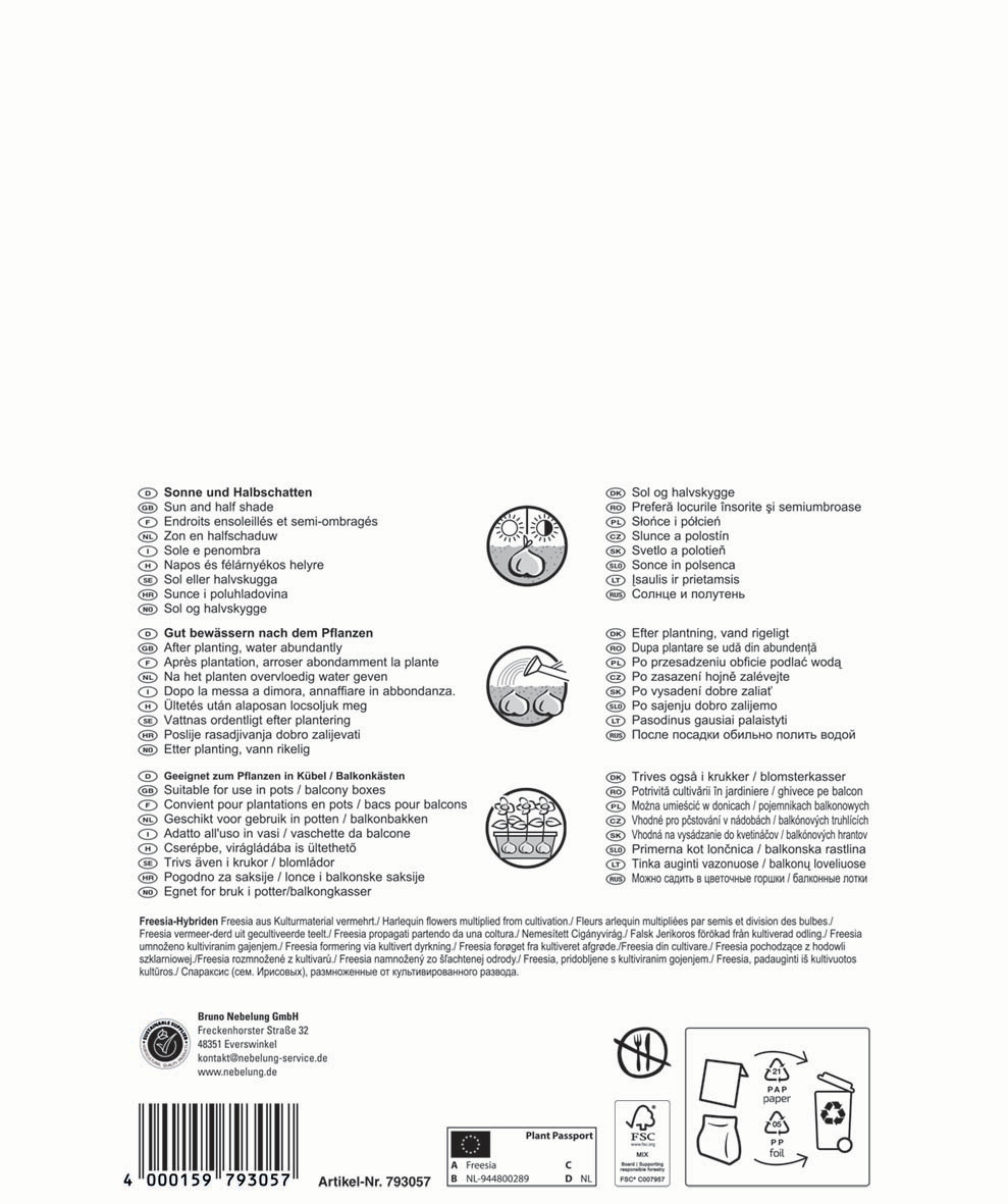 Die Freesien sind eine schon lange verwendete hervorragende Schnittblume. Sie verströmen einen angenehmen Duft und bieten mit ihren leuchtenden Farben auch Insekten Nahrung im August/September. Man kann sie im Beet wie auch in Kübeln anpflanzen.| Kurzbezeichnung : | Freesien einfach blühende Mischung |