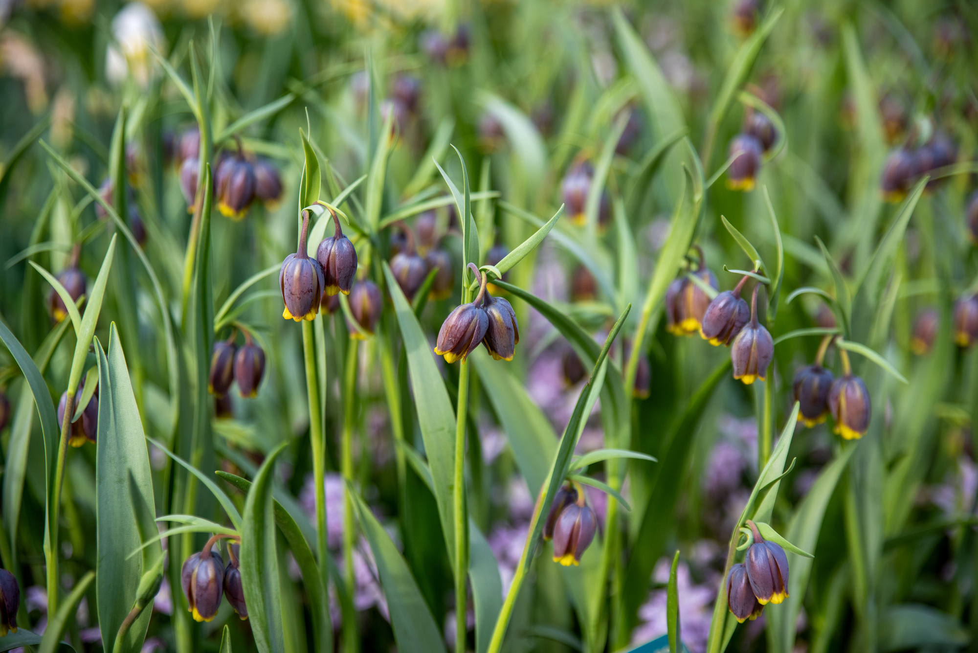 Die Fritillaria uva-vulpis, auch bekannt als Fuchstraube oder Glockenlilie, ist eine auffällige und faszinierende Frühlingsblume, die zur Gattung der Schachbrettblumen gehört. Diese Pflanze zeichnet sich durch ihre hängenden glockenförmigen Blüten aus, die außen bräunlich Lila schimmern und leicht bereift sind. Der äußere Rand und das Innere der Blüten sind Gelb und in verschiedenen Brauntönen gemustert. An einem Stängel können bis zu zwei Blütenglocken herabhängen, die auch eine wertvolle und wichtige Nahrungsquelle für unsere Nützlinge sind.Heimisch ist die Fuchstraube in der Osttürkei, im Nordwesten des Irak und im Westen des Iran. Dort wächst sie bevorzugt auf feuchten Wiesen in den Waldteilen des Zagros-Gebirges.