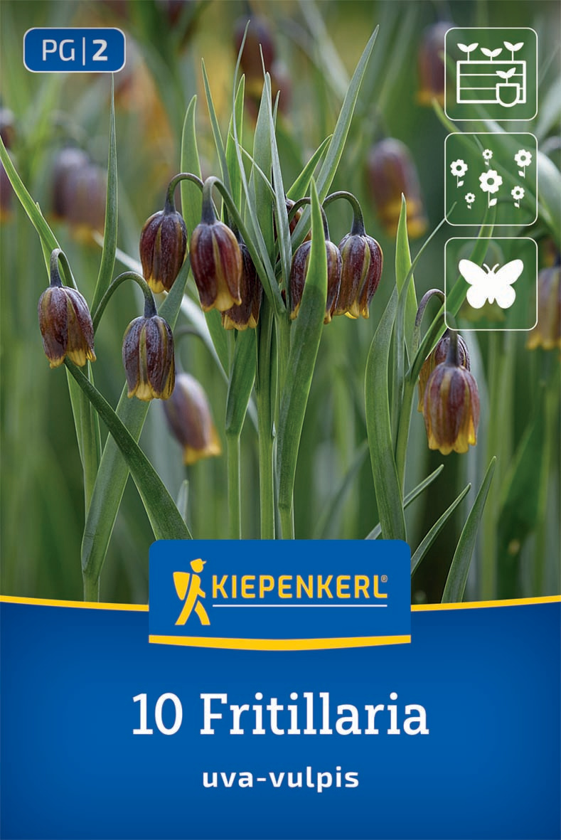 Die Fritillaria uva-vulpis, auch bekannt als Fuchstraube oder Glockenlilie, ist eine auffällige und faszinierende Frühlingsblume, die zur Gattung der Schachbrettblumen gehört. Diese Pflanze zeichnet sich durch ihre hängenden glockenförmigen Blüten aus, die außen bräunlich Lila schimmern und leicht bereift sind. Der äußere Rand und das Innere der Blüten sind Gelb und in verschiedenen Brauntönen gemustert. An einem Stängel können bis zu zwei Blütenglocken herabhängen, die auch eine wertvolle und wichtige Nahrungsquelle für unsere Nützlinge sind.Heimisch ist die Fuchstraube in der Osttürkei, im Nordwesten des Irak und im Westen des Iran. Dort wächst sie bevorzugt auf feuchten Wiesen in den Waldteilen des Zagros-Gebirges.