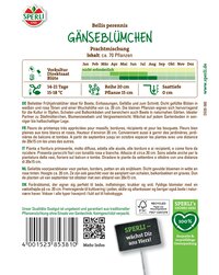 Diese Mischung enthält verschiedenfarbige, zweijährige, niedrig bleibende Frühlingsblumen. Das robuste Gänseblümchen eignet sich hervorragend für Rabatten, Einfassungen, schalen und Kübel, kleine Sträuße oder zum Verwildern in Blumenwiesen. Ein regelmäßiges Ausknipsen der verwelkten Blüten verlängert die Blühbereitschaft.