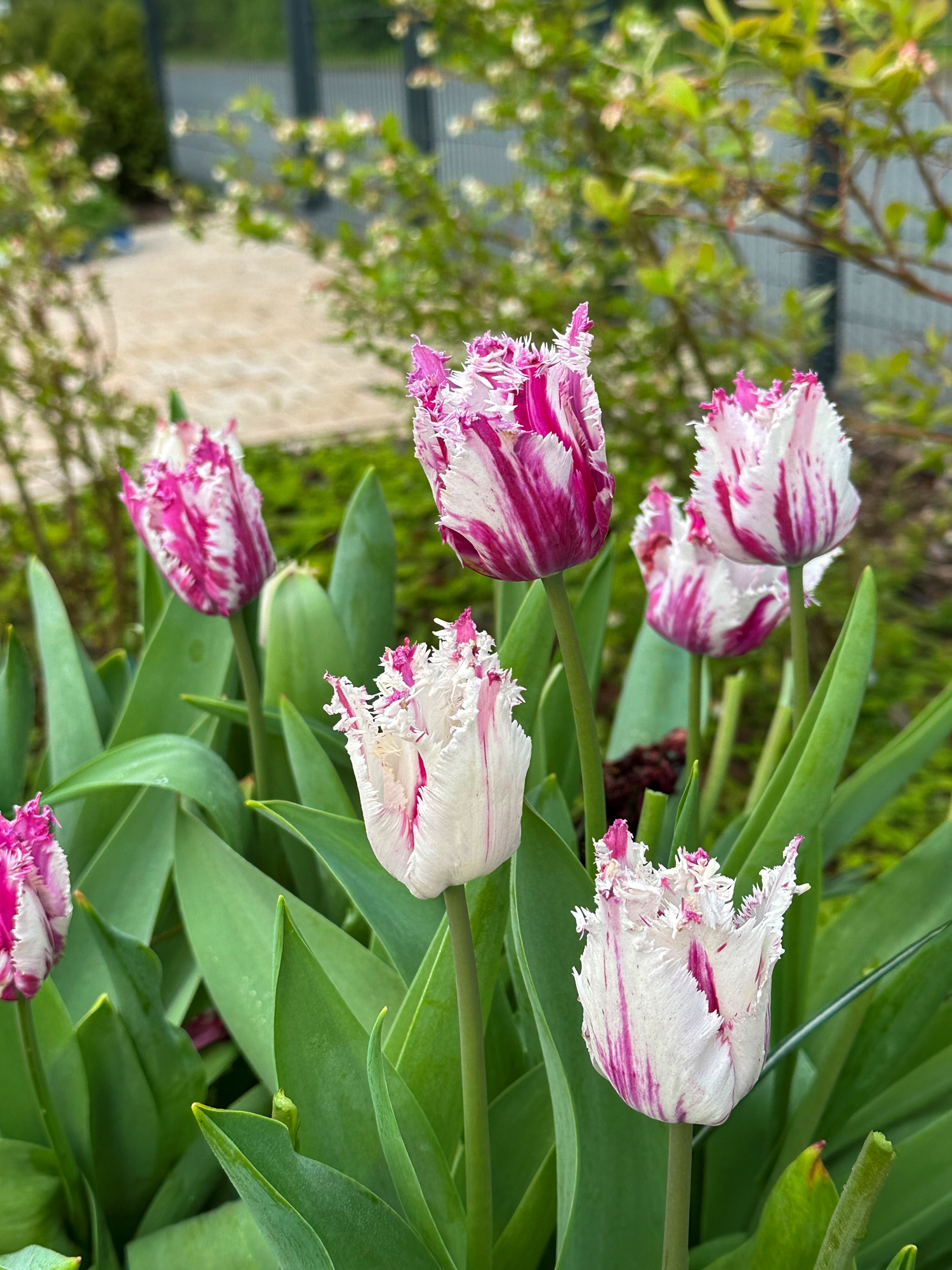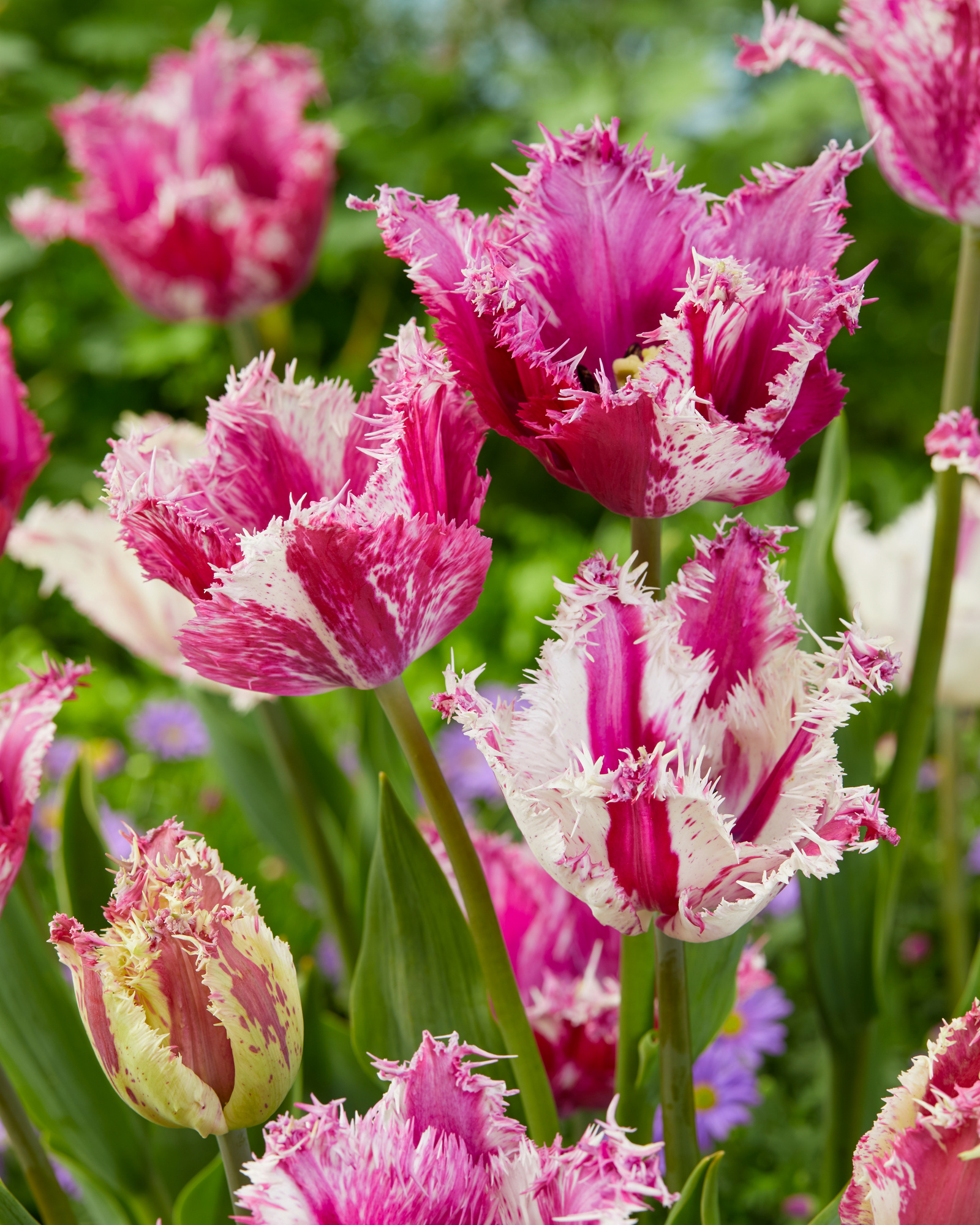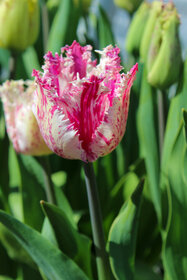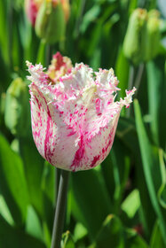 Farbbeschreibung: Weiße Blütenblätter in der Grundfarbe mit pink- & rosafarbenen Tupfen, Streifen und Flammen| Kurzbezeichnung : | Gefranste Tulpen Purple Circus |