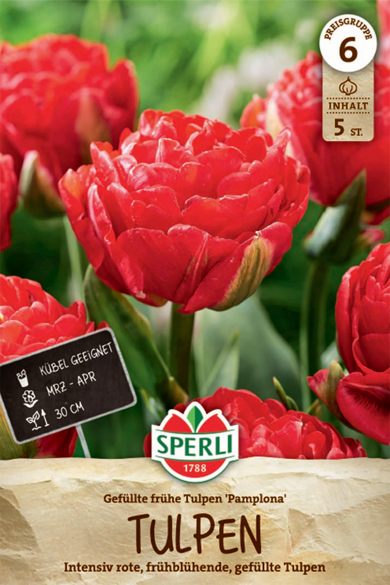 Feurig rot prangen die formschönen Blüten der Gefüllten Frühen Tulpe 'Pamplona' an den ca. 30 cm hohen Stängeln. Die Sorte ist bei der Anzucht nicht nur auf Beete beschränkt, sondern kann auch in Pflanzgefäßen kultiviert werden. Egal wo 'Pamplona' bei Dir wächst, an dem romantischen Flair und die Pfingstrosenoptik wirst Du Dich lange erfreuen!
