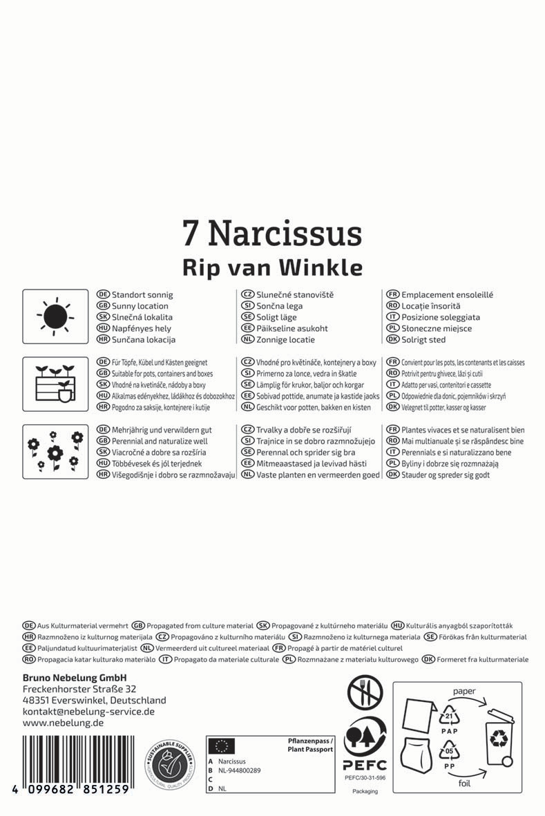 'Rip van Winkle' ist eine traditionsreiche Narzissensorte, die aus dem 19. Jahrhundert stammt. Schon für die flämischen Maler stand sie aufgrund ihrer außergewöhnlichen Erscheinung Portrait. Die stark gefüllten Blüten leuchten gelb und stellen insbesondere bei Gruppenpflanzung ein kleines florales Wunder dar. Aufgrund ihres niedrigen Wuchses von nur 15 cm kann 'Rip van Winkle' aber auch problemlos in Pflanzgefäßen kultiviert werden.