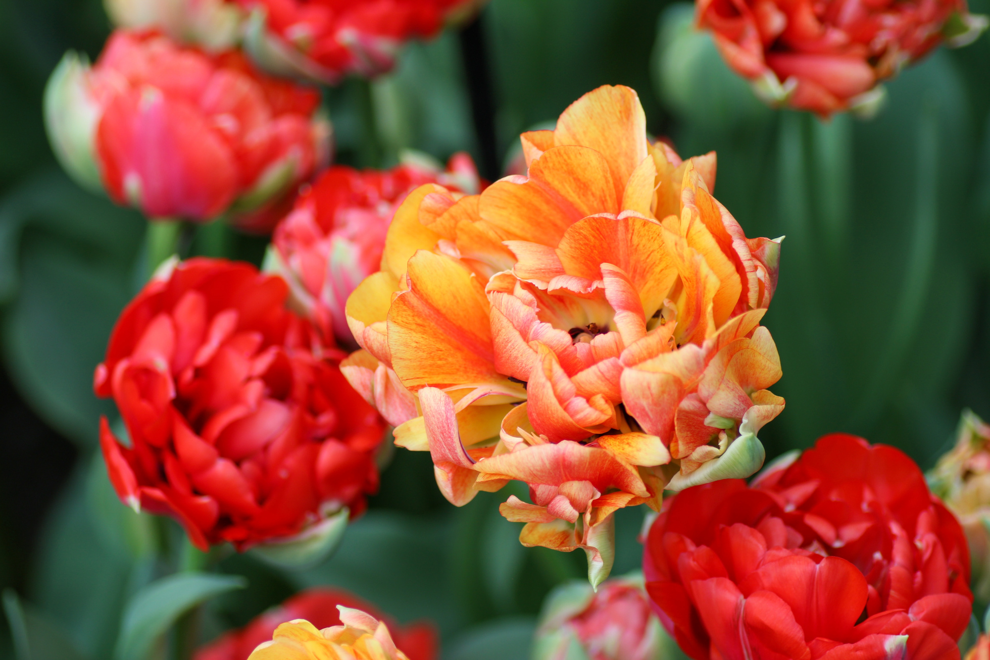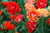Blütenfarbe verändert sich mit dem Aufblühen. Farben variieren in kräftigen Tönen von Hellgelb, zu einem Apricotorange mit auffällig roter Aderung bzw. Zeichnung, zu einem satten Rot. Im Verblühen verblassen die Farben in pastelligen Tönen.| Kurzbezeichnung : | Gefüllte Späte Tulpen Gudoshnik Double |