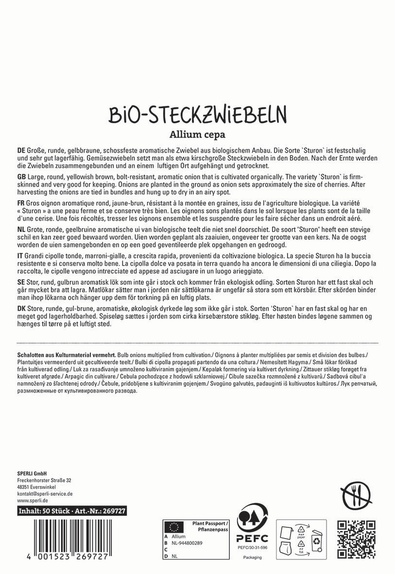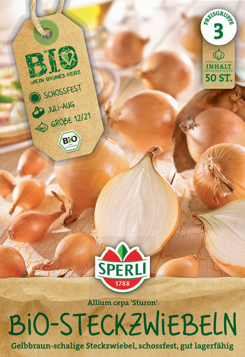 Große und runde Zwiebeln mit einer gelblichen bis bräunlichen Farbe entwickelt die gelbe Bio-Steckzwiebel 'Sturon'. Sie ist äußerst schmackhaft und dazu auch noch sehr gut haltbar, da sie festschalig ist. Die gelbe Bio-Steckzwiebel 'Sturon' ist schossfest und sehr gut lagerfähig. Des Weiteren stammt sie aus bestem biologischen Anbau.Unverzichtbar sind die Steckzwiebeln und Schalotten in BIO-Qualität. Ein verantwortungsvoller Umgang mit unserer Gesundheit und auch der Umgang mit der Umwelt sollte jedem am Herzen liegen. Gärtnern im Einklang mit der Natur, umweltschonend und nachhaltig – diese Bedürfnisse erfüllen wir mit der BIO-Vielfalt von SPERLI.