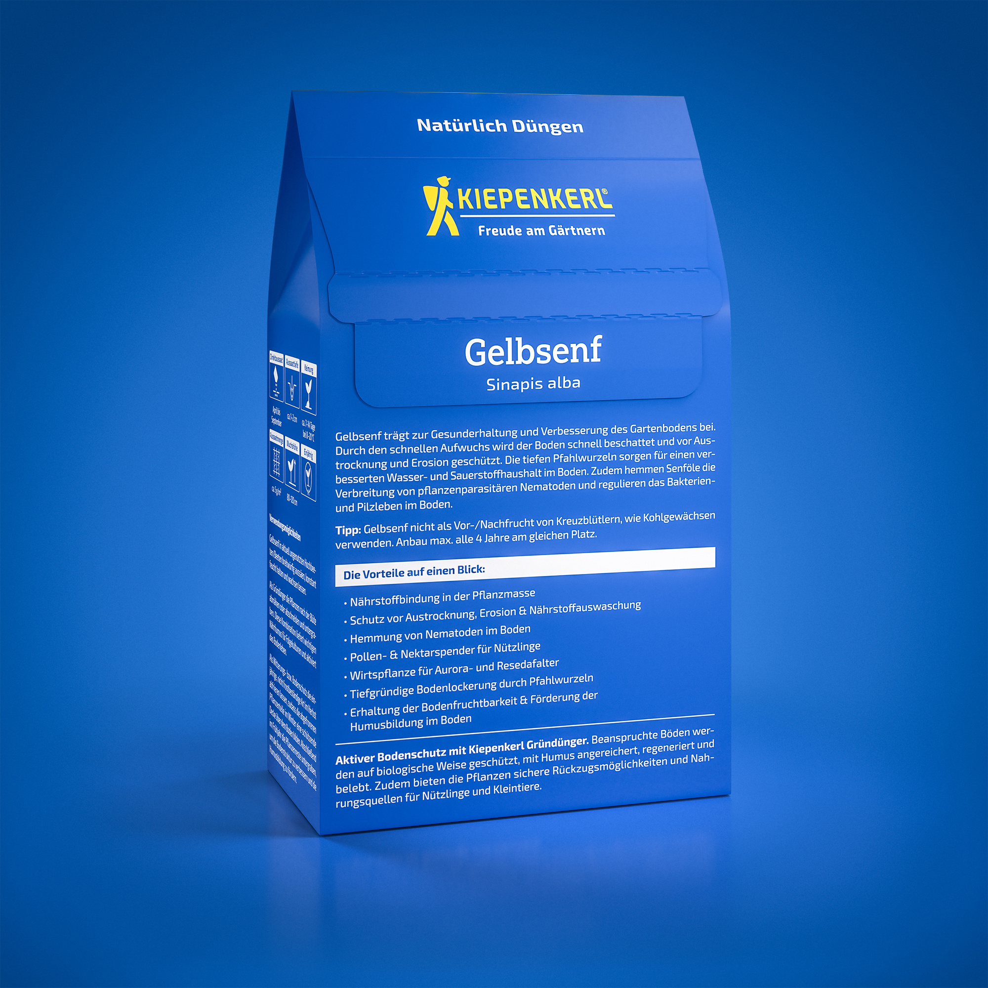 Gelbsenf ist eine hervorragende Wahl, wenn es darum geht, die Gesundheit und Qualität Ihres Gartenbodens zu verbessern. Dank seines schnellen Aufwuchses beschattet Gelbsenf den Boden rasch, was ihn vor Austrocknung und Erosion schützt. Die tiefreichenden Pfahlwurzeln sorgen zudem für eine bessere Wasser- und Sauerstoffzufuhr im Boden. Die Senföle im Gelbsenf hemmen die Ausbreitung von pflanzenparasitären Nematoden und regulieren das Bodenleben, einschließlich Bakterien und Pilzen.