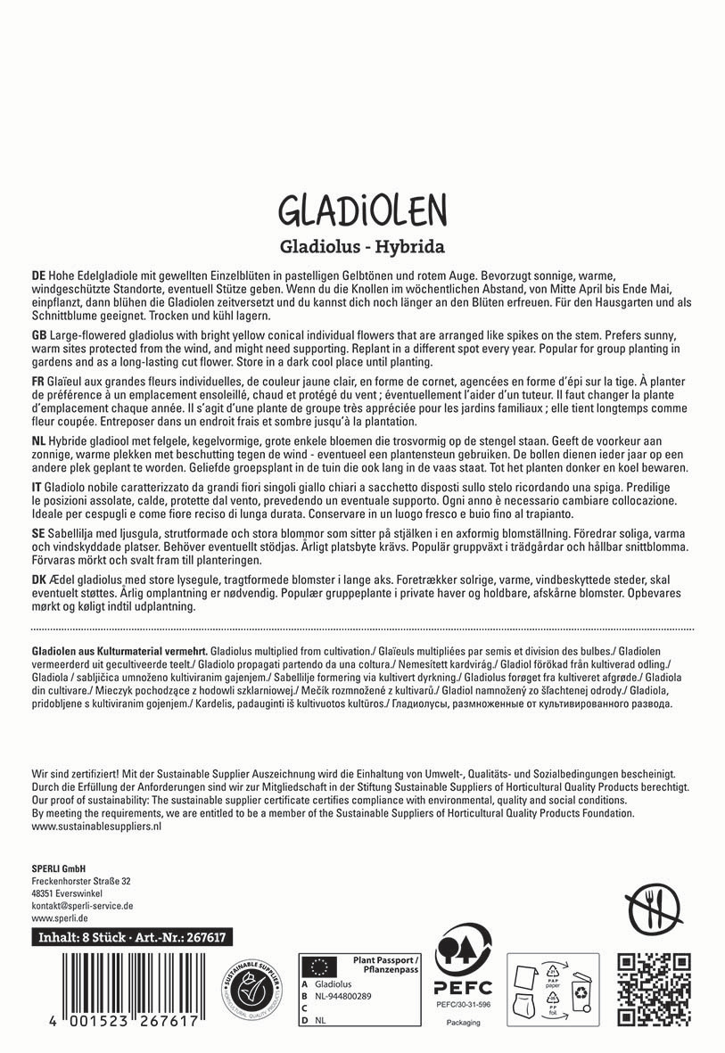Die sonnengelben Gladiolen der Sorte 'Maxial' von Sperli bieten Dir wunderschöne, leuchtende Blüten. Perfekt geeignet für bunte Blumenbeete oder als langlebige Schnittblumen in der Vase.Wenn du eine konstante Blumenernte wünschst, pflanze die Knollen zeitlich versetzt. Die Gladiolen `Maxial‘ blühen je nach Pflanzzeit von Ende Juni bis September. Dank ihrer Wuchshöhe von 100-120 cm sind sie auch in größeren Beeten ein toller Blickfang. Achte darauf, die Knollen erst ab Ende April in den Boden zu legen, wenn keine Frostgefahr mehr besteht. Setze sie in einem Abstand von 10 bis 15 cm und etwa 10 cm tief an einem gut durchlässigen, sonnigen und geschützten Standort.