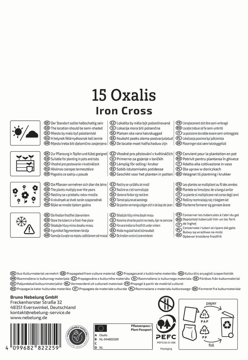 Diese Pflanze bringt Glück! Das schreiben ihr zumindest einige Menschen zu, denn Klee mit vier Blättern wird auch Glücksklee genannt. Auffällig ist neben der Blätteranzahl von 'Iron Cross' auch die dunkel gefärbte Blattmitte. Gegen Abend schließen die Blätter sich und erinnern dann an die Form eines Schirms. Die Blüten des Glücksklees leuchten in einem Dunkelrosa und haben eine gelben Blütenmitte. Der Klee ist ideal zur Begrenzung eines Beetes oder der Dekoration von kleineren Töpfen geeignet.