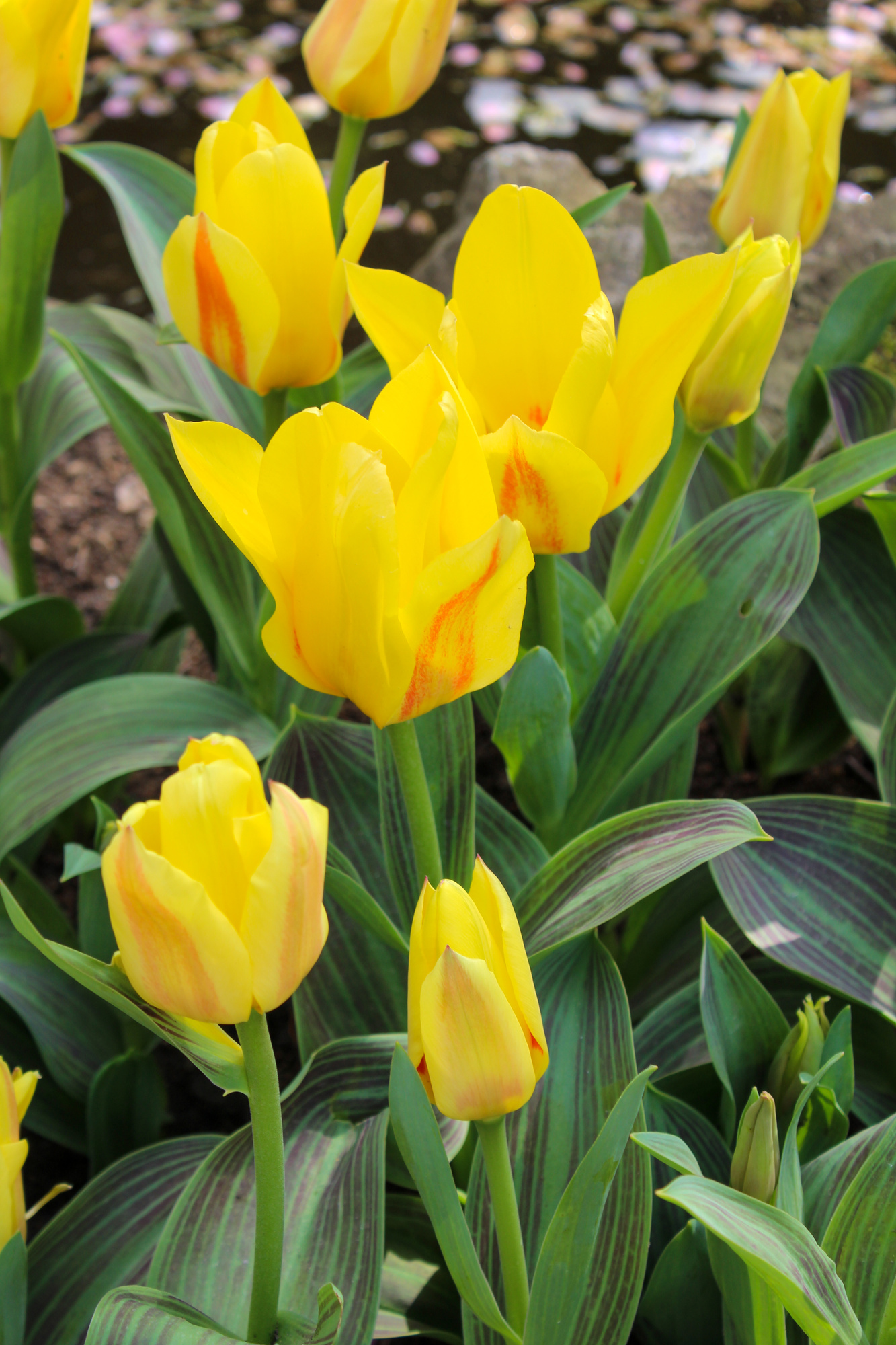 Farbbeschreibung: Zitronengelb, apricot-rosa geflammt, Blätter gefleckt