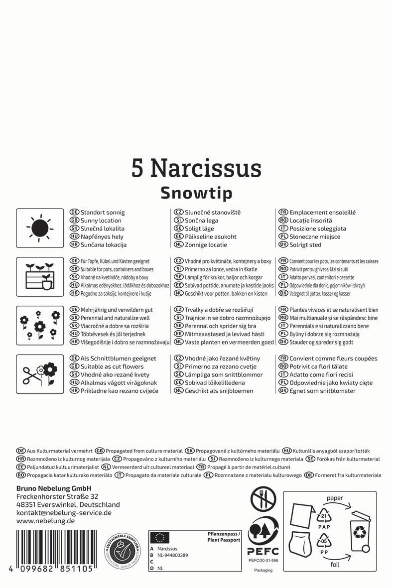Diese wunderschöne großkronige Narzisse `Snowtip` verdankt ihren Namen den schneeweißen Flecken, die an den Rändern und zwischen dem tief gezackten zitronengelben Kelch erscheinen. Der dekorativ gerüschte Kelch ragt aus der verblassenden gelbgrünen Blütenkrone heraus – ein atemberaubender Effekt, begleitet von himmlischem Duft. Die Narzisse ist eine ideale Schnittblume, sie glänzt im Blumenstrauß, mono oder gemeinsam mit anderen Blüten, und bringt einen Hauch von Frische und Eleganz in jeden Raum. Selbstverständlich gehört `Snowtip` in Blumenbeeten, Steingärten, Kübelund Töpfen einfach mit dazu. Die mittelfrühe Sorte wird ca. 35 cm hoch und blüht im späten März bis Anfang April. Die Sorte `Snowtip` ist besonders robust, sie blüht jedes Jahr zuverlässig wieder und vermehrt sich durch Brutzwiebeln rasch – also beste Eigenschaften für die Garten- und Landschaftsgestaltung. Wenn Narzissensammler eine ausgefallene Sorte suchen, die sowohl pflegeleicht als auch elegant ist, dann ist die `Snowtip` Narzisse die perfekte Wahl. Diese zauberhaften Sorte bringt frischen Wind in den Garten und erfreut mit Liebreiz und Robustheit.| Kurzbezeichnung : | Großkronige Narzisse Snowtip |