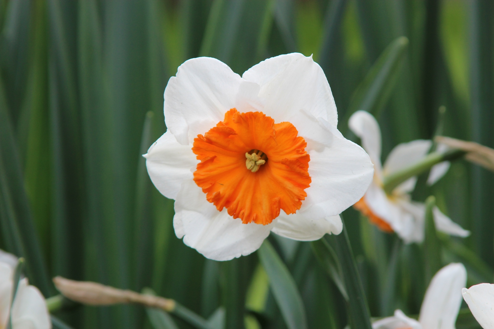 Farbbeschreibung: Weißer Kranz, Große Weit Geöffnete Orangerote Krone| Kurzbezeichnung : | Großkronige Narzissen Johann Strauss |