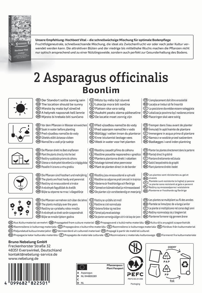 Bei dem Grünspargel 'Boonlim' handelt es sich um eine mehrjährige und mittelfrühe Sorte, die viele Mineralstoffe sowie Vitamine enthält. Sie besitzt fest geschlossene Köpfe und dicke Stangen, die bei der Zubereitung nicht geschält werden müssen. Der Grünspargel 'Boonlim' zeichnet sich zudem dadurch aus, dass er eine hohe Widerstandsfähigkeit gegen den Botrytis-Pilz hat. Bei der Kultur von Grünspargel ist ein Anhäufeln nicht notwendig. Im Gegensatz zum Bleichspargel wird Grünspargel einfach bodennah mit dem Messer geerntet und nicht gestochen. Im Herbst, nach dem Vergilben, entfernen Sie das Kraut. Die erste Ernte des Grünspargel 'Boonlim' ist nach zwei Jahren möglich.