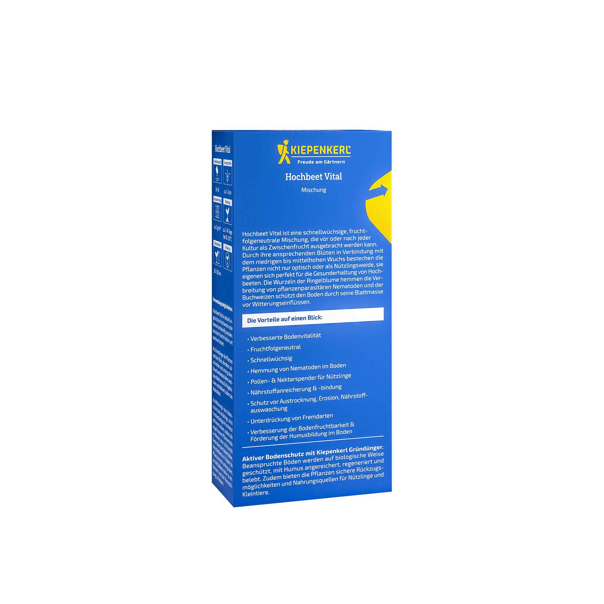 Hochbeet Vital ist eine fruchtfolgeneutrale, schnellwachsende Mischung, die ideal als Zwischenfrucht vor oder nach jeder Kultur verwendet werden kann. Die attraktiven Blüten und der niedrige bis mittelhohe Wuchs machen die Pflanzen nicht nur optisch ansprechend und zu einer willkommenen Nützlingsweide, sondern auch perfekt zur Gesunderhaltung Ihrer Hochbeete. Die Wurzeln der Ringelblume hemmen die Ausbreitung pflanzenparasitärer Nematoden, während der Buchweizen durch seine Blattmasse den Boden vor Witterungseinflüssen schützt.