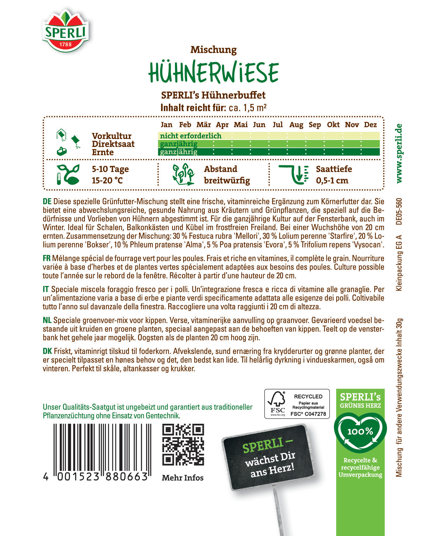 Diese spezielle Grünfutter-Mischung stellt eine frische, vitaminreiche Ergänzung zum Körnerfutter dar. Sie bietet eine abwechslungsreiche, gesunde Nahrung aus Kräutern und Grünpflanzen, die speziell auf die Bedürfnisse und Vorlieben von Hühnern abgestimmt ist. Für die ganzjährige Kultur auf der Fensterbank, auch im Winter. Ideal für Schalen, Balkonkästen und Kübel im frostfreien Freiland. Bei einer Wuchshöhe von 20 cm ernten. Zusammensetzung der Mischung: 30 % Festuca rubra 'Mellori', 30 % Lolium perenne 'Starfire', 20 % Lolium perenne 'Bokser', 10 % Phleum pratense 'Alma', 5 % Poa pratensis 'Evora', 5 % Trifolium repens 'Vysocan'| Kurzbezeichnung : | Hühnerwiese SPERLI's Hühnerbuffet |