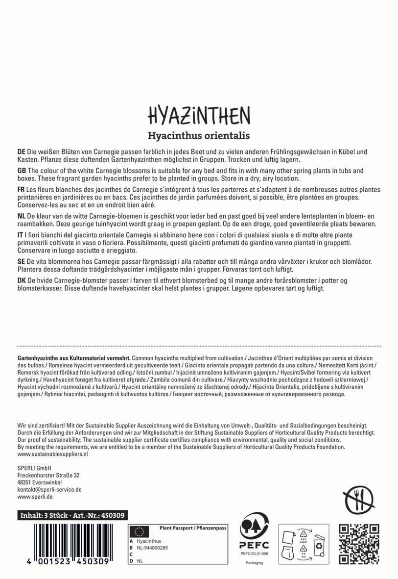 'Carnegie' gedeiht am besten in sonnigen oder halbschattigen Lagen. Die Pflanzen sind winterhart und mehrjährig und versprühen zur Blütezeit einen angenehmen Duft. Pflanzen kannst Du die Zwiebeln im Zeitraum von September bis Dezember.