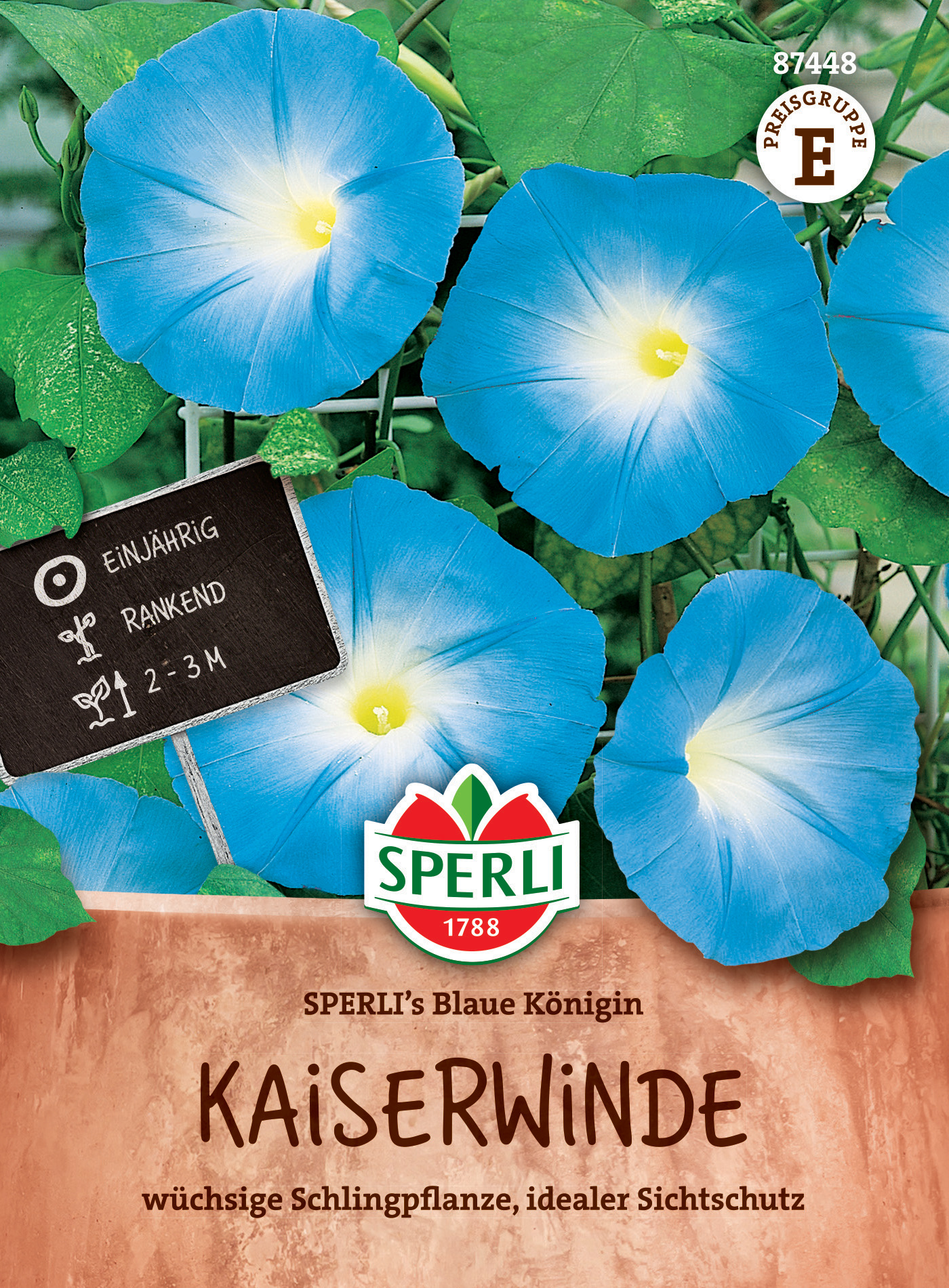 SPERLI's Blaue Königin ist eine einjährige, schnellwüchsige Kletterpflanze mit kräftig leuchtend blauen Blüten. Ideal zur Begrünung von Zäunen, Drähten, Stangen oder Pergolen. Höhe: 200 cm.| Kurzbezeichnung : | Kaiserwinde SPERLI's Blaue Königin |