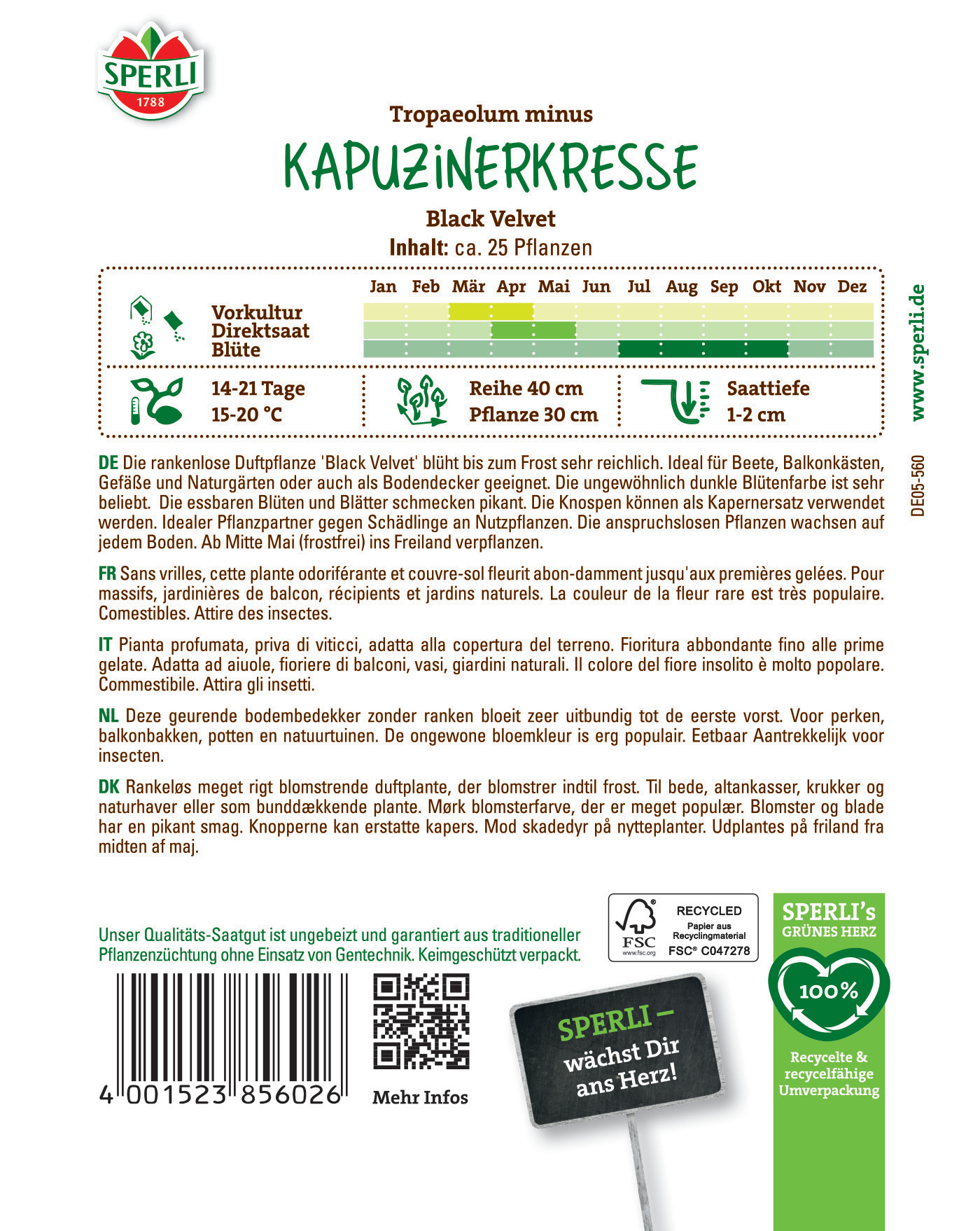 Eine schöne Sorte mit fast schwarzen Blütenblättern. Vielseitiger Nutzen, ob als Topfpflanze, für Beet- und Balkonkästen oder nach der Ernte für die moderne Küche.| Kurzbezeichnung : | Kapuzinerkresse Black Velvet |