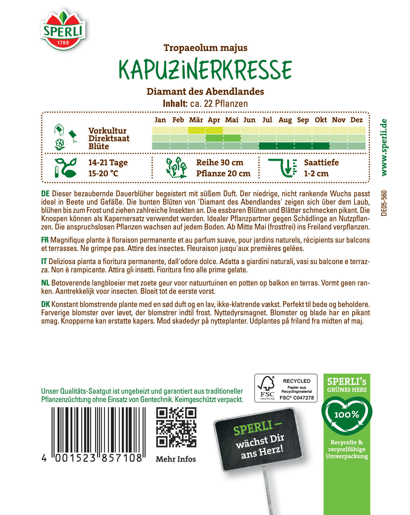 Die Kapuzinerkresse Diamant des Abendlandes ist eine einjährige, einfach zu ziehende, niedrigbleibende und nicht rankende Gruppenpflanze für Beete, Rabatten, Schalen oder Töpfe. Auch an Mauern, neben Treppen oder auf Baumscheiben kommt diese Pflanze gut zur Geltung. Die Blüten, die Blütenknospen und die Blätter sind essbar. Aus den Blütenknospen können Kapern hergestellt werden, und die würzig pfeffrig schmeckenden Blätter und Blüten können im Salat, zu Kräuterbutter oder Quark verarbeitet werden.| Kurzbezeichnung : | Kapuzinerkresse Diamant des Abendlandes |