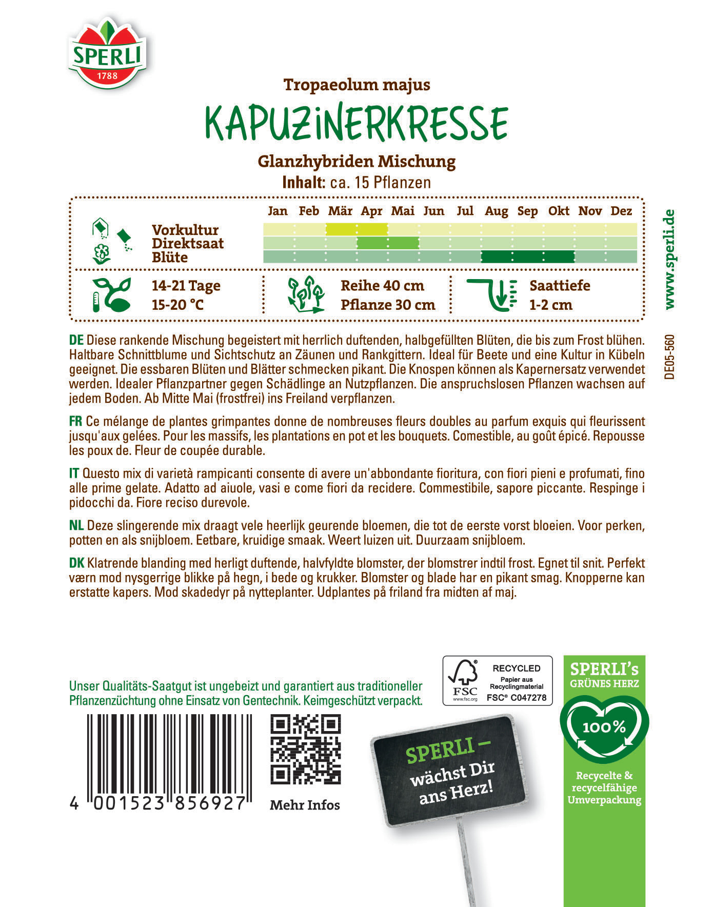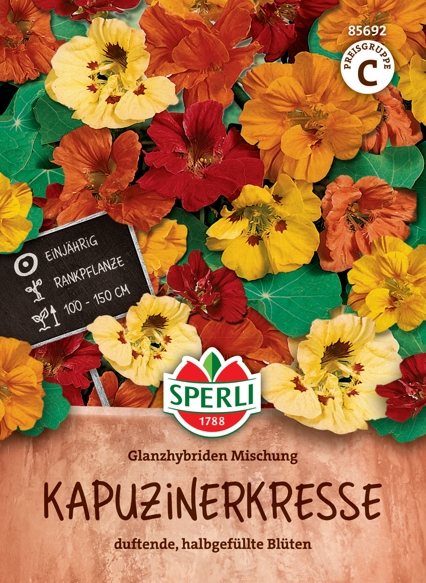 Die Glanzhybriden Mischung besteht aus verschiedenen, gefüllt blühenden und rankenden, einjährigen Pflanzen. Kapuzinerkresse ist eine einfach zu ziehende Gruppenpflanze für Beete, rabatten, schalen oder Töpfe. Auch an Mauern, neben Treppen oder auf Baumscheiben kommt diese Pflanze gut zur Geltung. Die Blüten, die Blütenknospen und die Blätter sind essbar. Aus den Blütenknospen können Kapern hergestellt werden und die würzig, pfeffrig schmeckenden Blätter und Blüten können im salat, in Kräuterbutter oder auch in Quark verarbeitet werden.| Kurzbezeichnung : | Kapuzinerkresse Glanzhybriden Mischung |