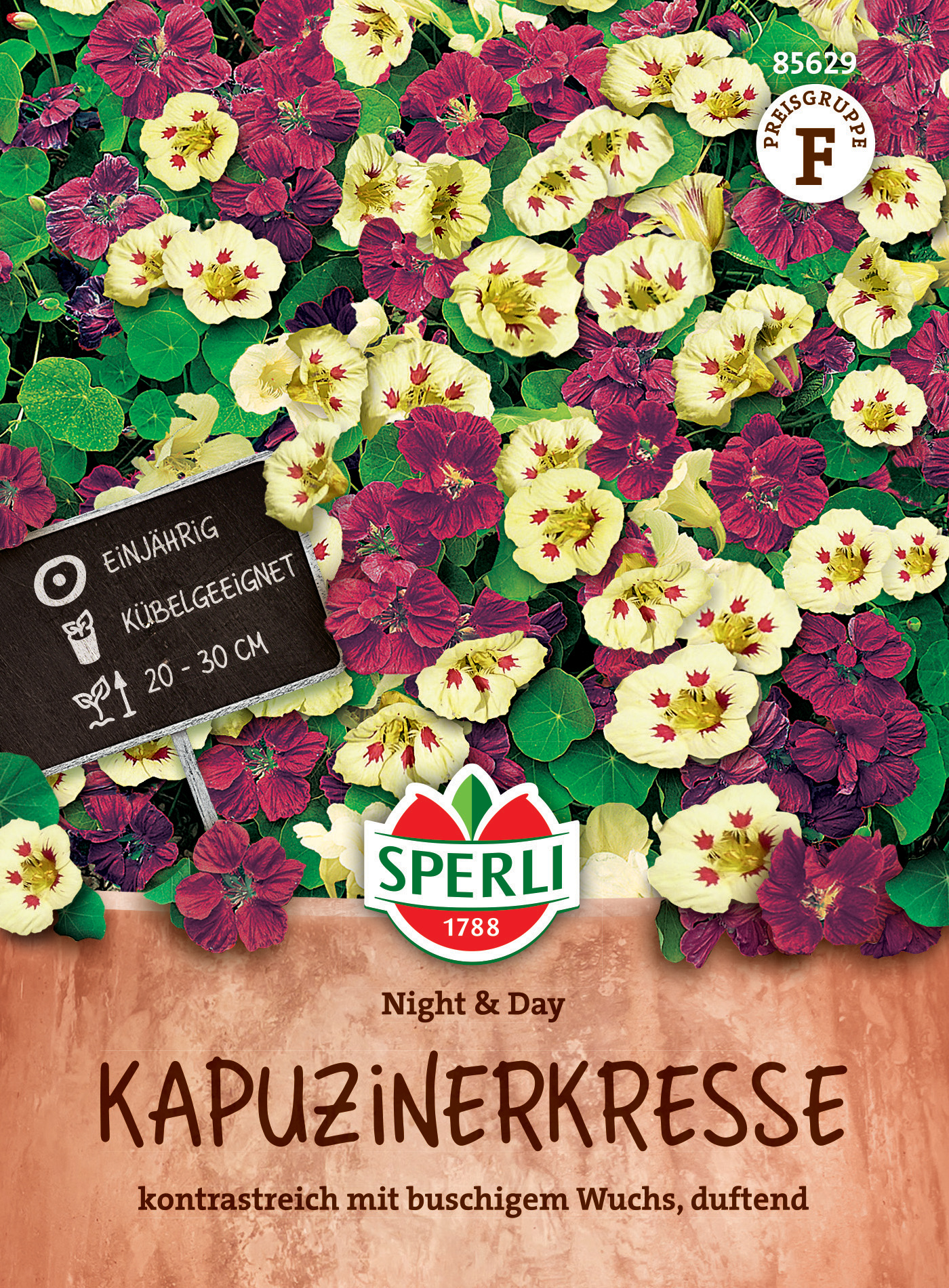 Eine niedrige, nicht rankende Mischung, die unermüdlich blüht. Mit dunkelroten und weißen blüten.| Kurzbezeichnung : | Kapuzinerkresse Night & Day |