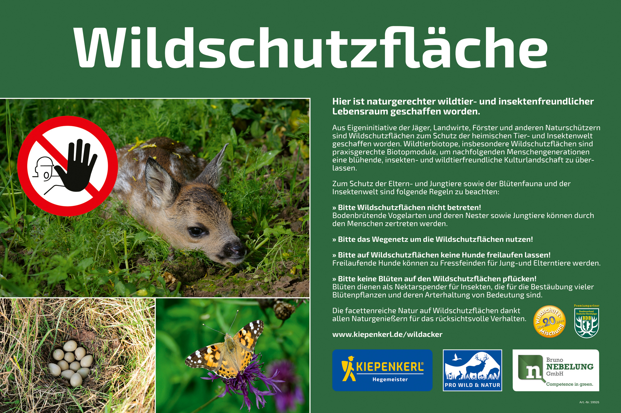 Für angelegte Wildackerflächen stellen wir ein Informationsschild bereit. Hier werden die Passanten im Besonderen darauf hingewiesen, dass hier eine Ruhezone für Wildtiere geschaffen wurde und Hunde aus diesem Bereich ferngehalten werden sollten.