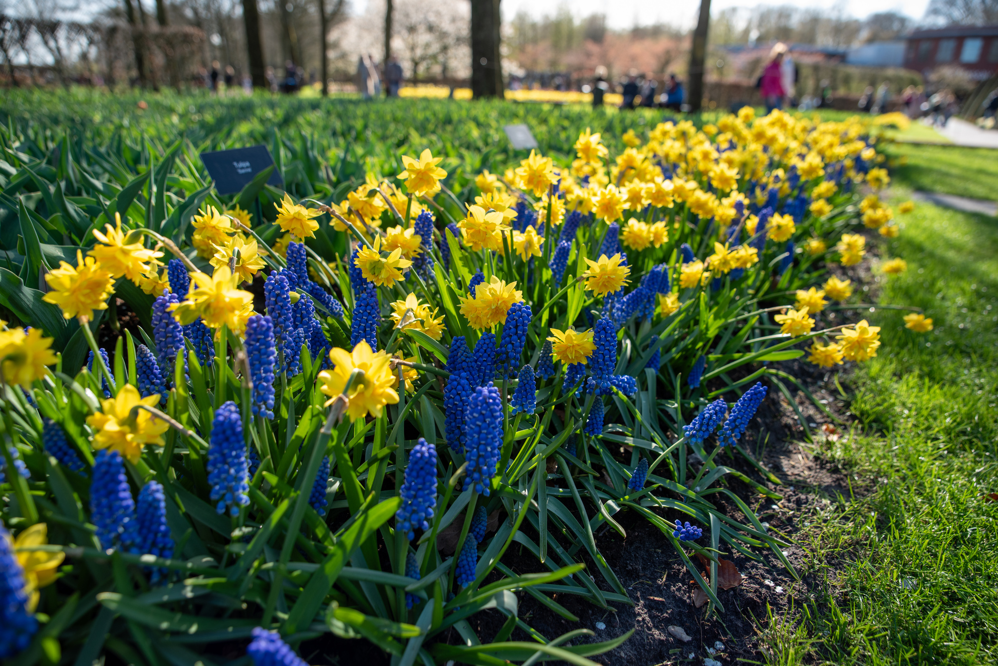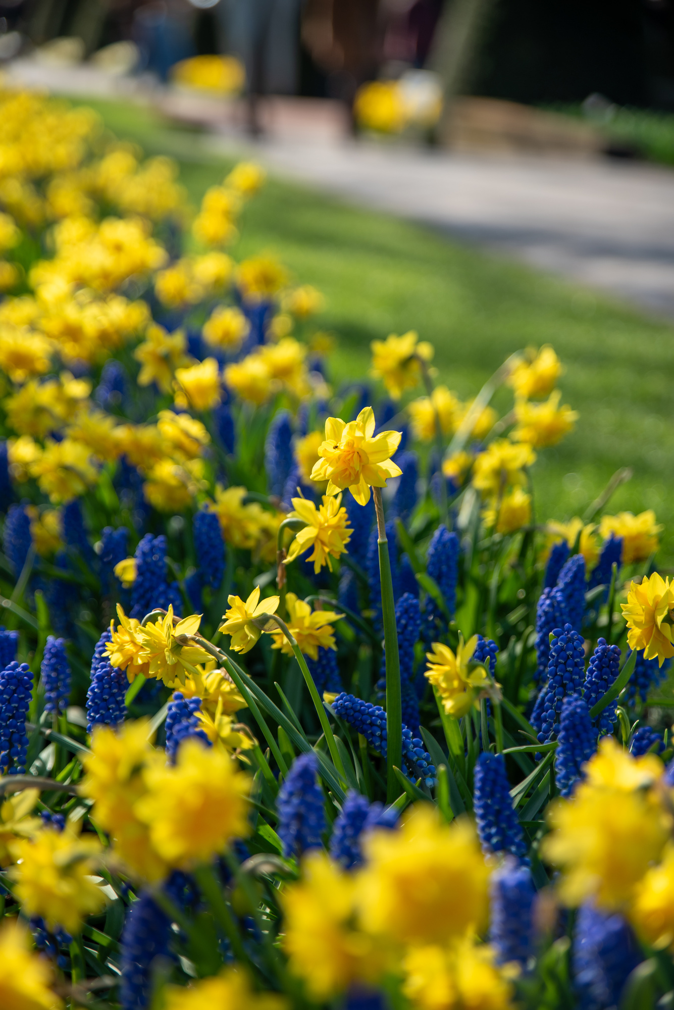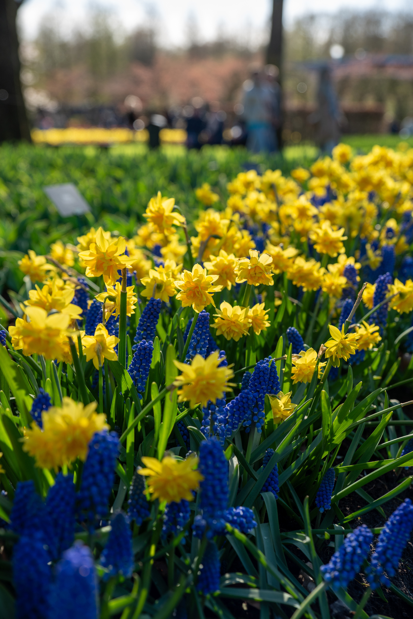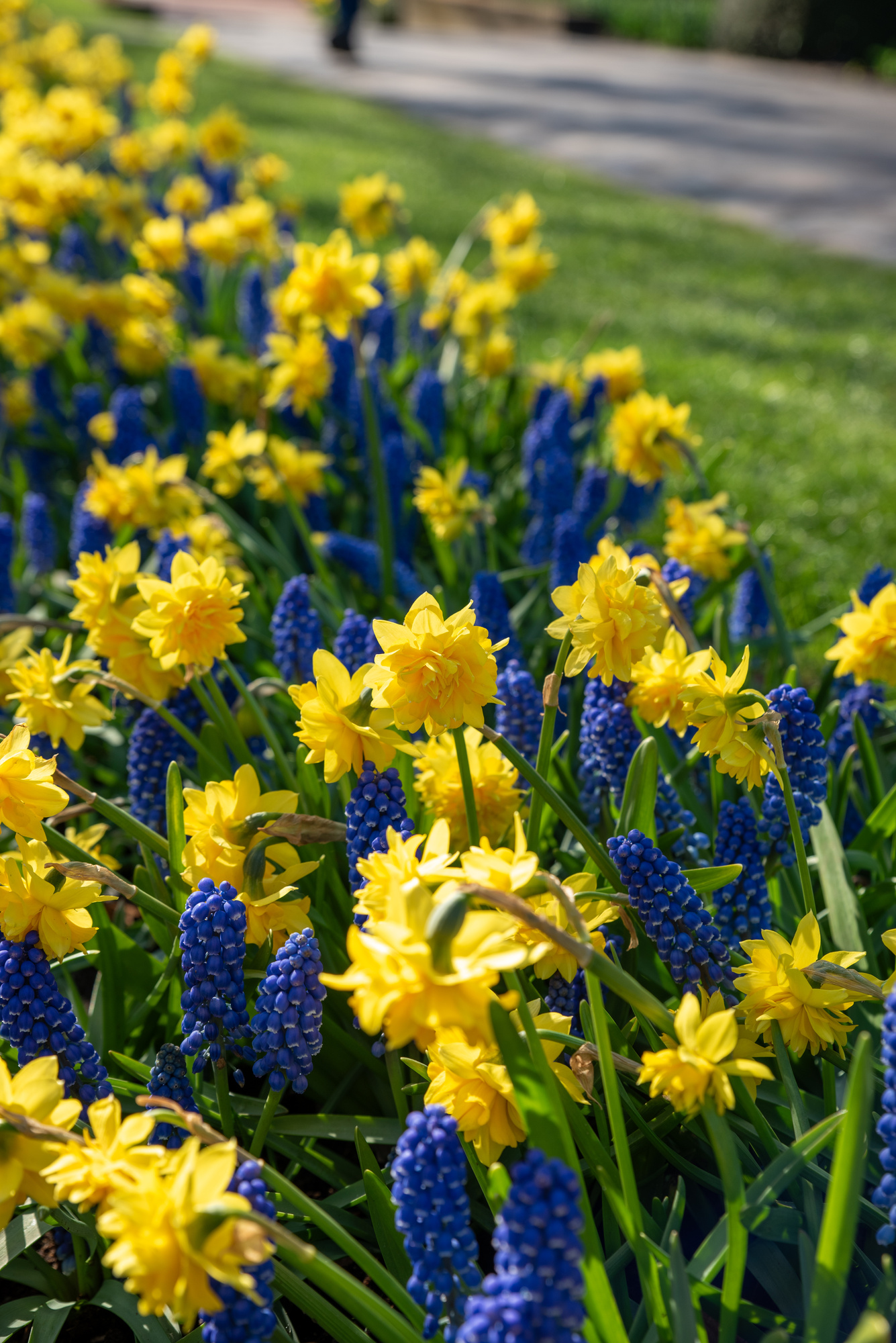 Die goldgelben gefüllten Narzissen verleihen mit ihrem eleganten Erscheinungsbild eine besondere Note, während die strahlend blauen Traubenhyazinthen für einen lebendigen Farbkontrast sorgen.