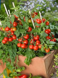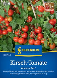 Die Kirschtomate 'Ampelo Rot®' ist ebenfalls eine buschig kompakte Sorte mit leicht überhängendem Wuchs. Sie ist optimal für Ampeln, Balkonkästen, Kübel oder Hochbeete geeignet. Hierbei müssen die Seitentriebe nicht entfernt werden. Die kleinen, roten, fruchtig-süßen Früchte wiegen 10-15 g und überzeugen durch ihren Geschmack. Mit einer Wuchshöhe von 30 bis 40 cm ist sie perfekt für jeden Garten. Freuen Sie sich auf die süßen Aromen und die ertragreiche Ernte dieser robusten Kirschtomate! Entdecken Sie die Kirschtomate 'Ampelo Rot®' und bringen Sie frisches Gemüse auf Ihren Tisch!| Kurzbezeichnung : | Kirsch-Tomate Ampelo Rot®, F1 |