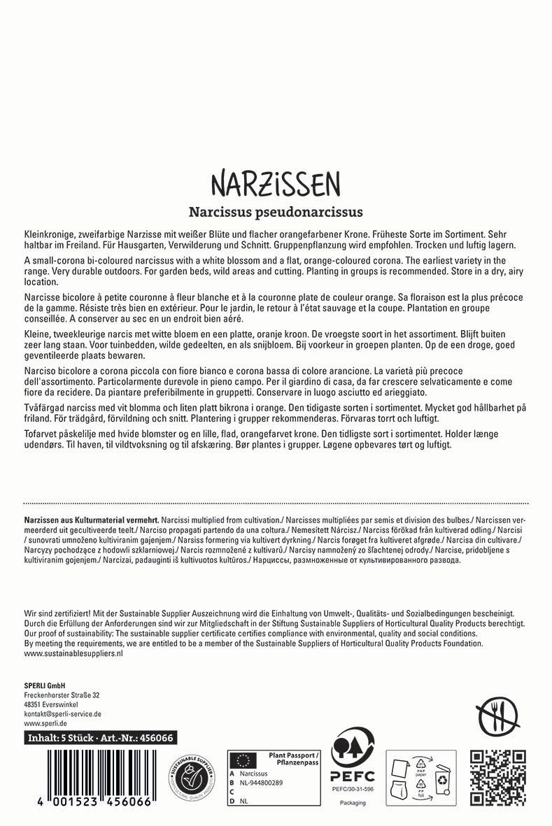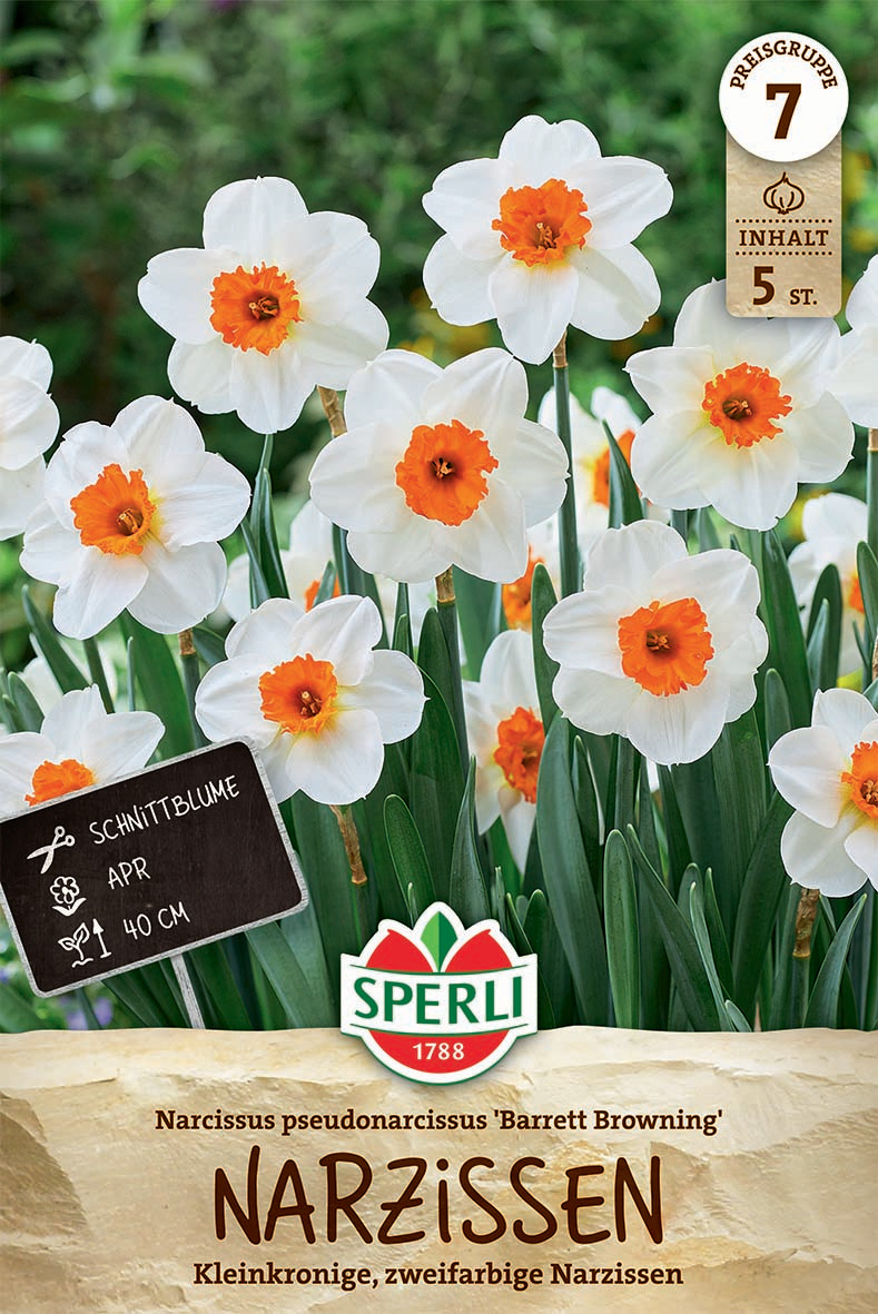 Die Kleinkronige Narzisse 'Barrett Browning' bietet Dir mit ihren weißen Blüten und der orangen Krone wahrlich frühlingshafte Farben! Sie zählt zur frühesten Sorte in unserem Sortiment und stet bereits im März in herrlicher Blüte. Im Freiland ist die ca. 40 cm hohe Blumenschönheit sehr lange haltbar und behält diese Eigenschaft auch als Schnittblume bei. Zögere daher nicht, die Pflanzen zur Blütezeit zu schneiden, um damit auch Dein Zuhause stilsicher zu dekorieren!